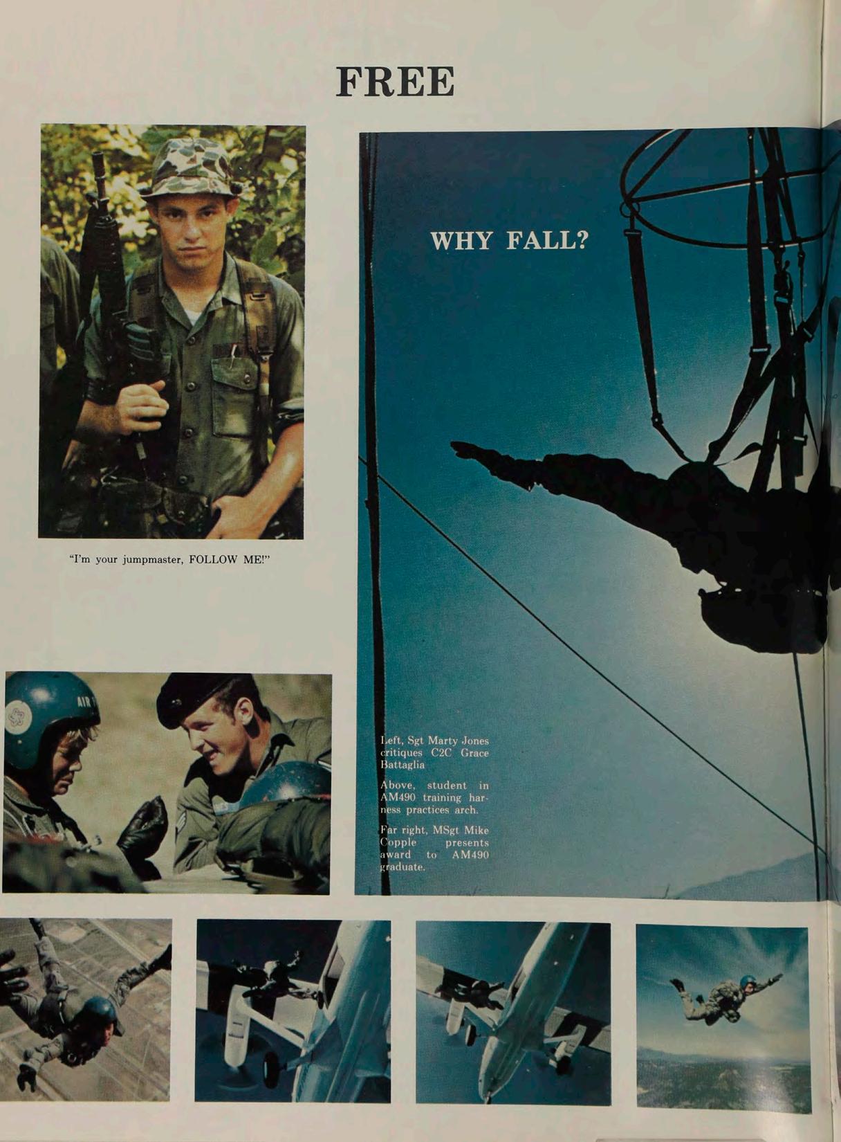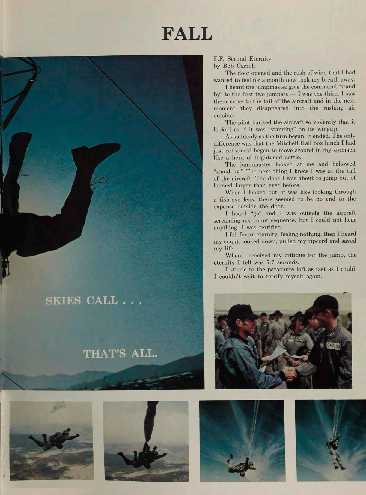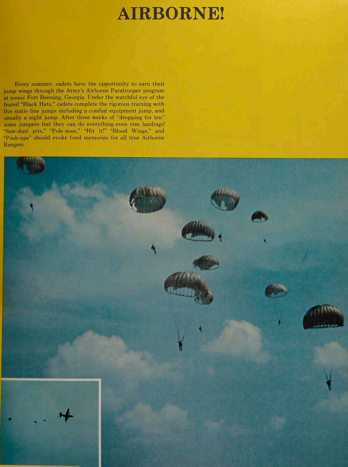 Below left: Mike Downs is still waiting for his stomach to come back to earth.Every summer, cadets have the opportunity to earn their jump wings through the Army’s Airborne Paratrooper program at scenic Fort Benning, Georgia. Under the watchful eye of the feared “Black Hats,” cadets complete the rigorous training with five static-line jumps including a combat equipment jump, and usually a night jump. After three weeks of “dropping for ten” some jumpers feel they can do everything-even tree landings! “Saw-dust pits,” “Pole-man,” “Hit it!” “Blood Wings,” and “Push-ups” should evoke fond memories for all true Airborne Rangers.