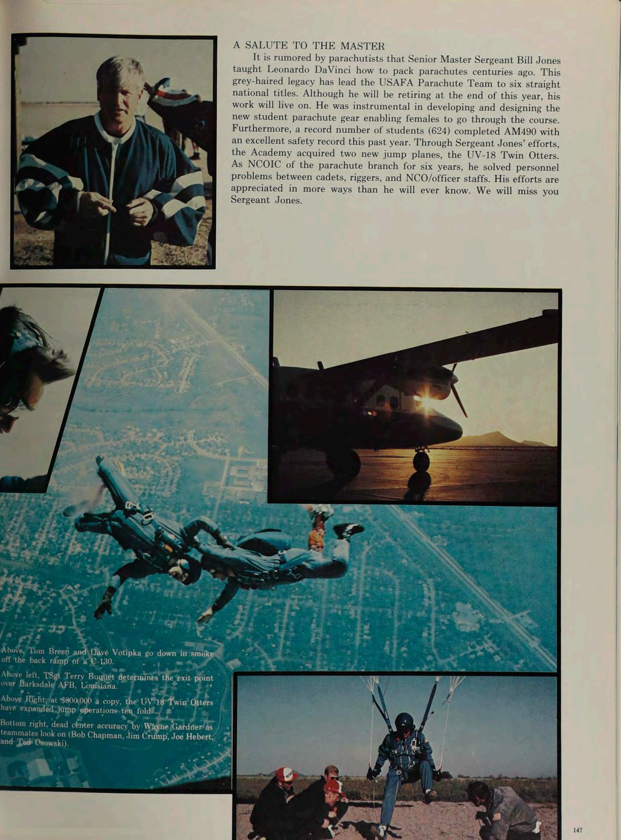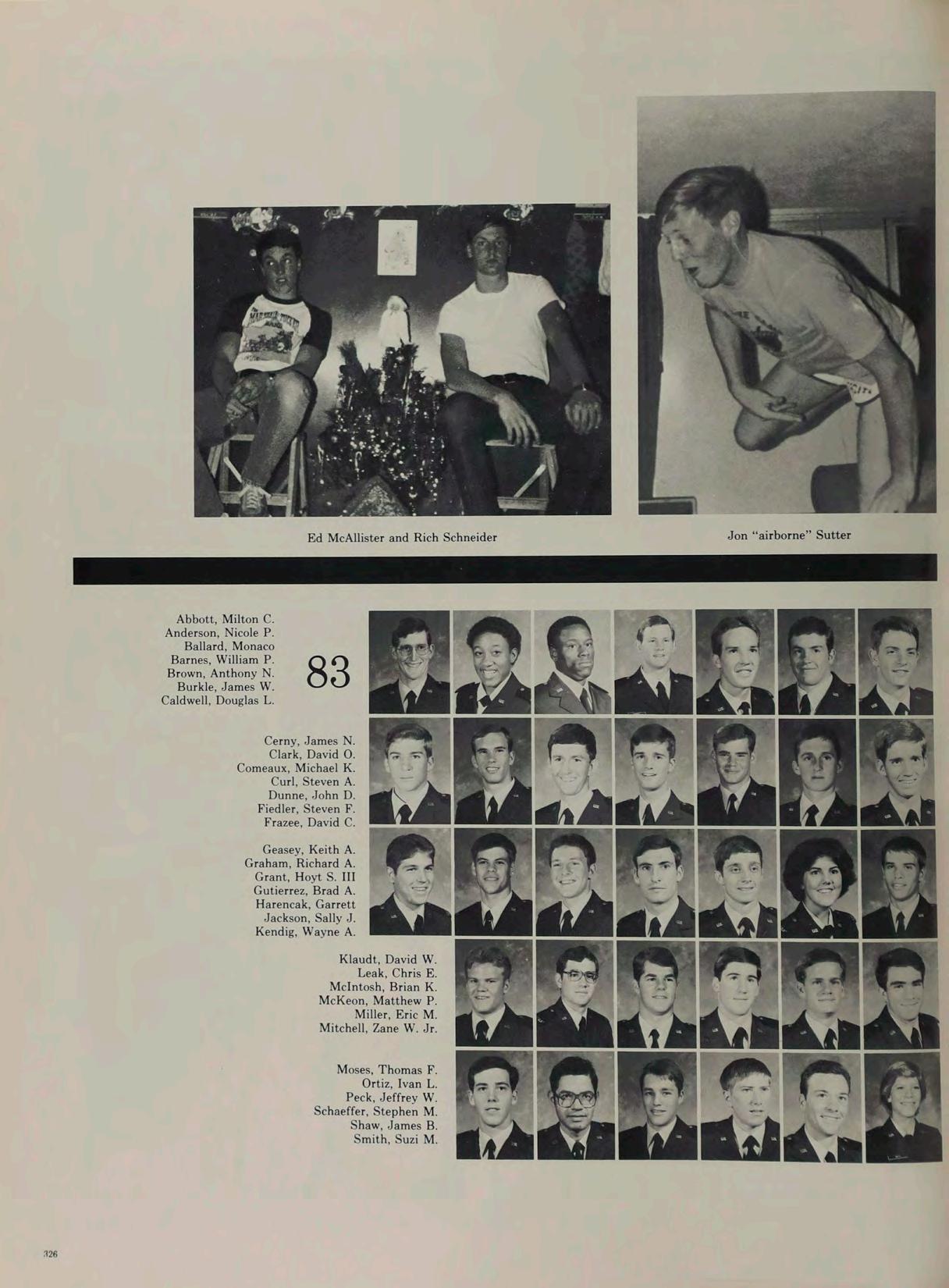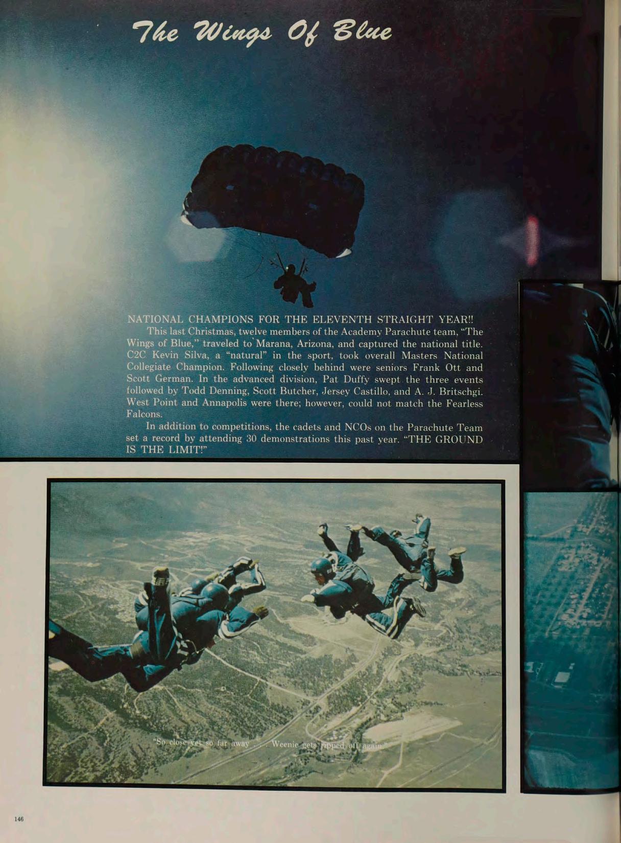 Below left: Mike Downs is still waiting for his stomach to come back to earth.Every summer, cadets have the opportunity to earn their jump wings through the Army’s Airborne Paratrooper program at scenic Fort Benning, Georgia. Under the watchful eye of the feared “Black Hats,” cadets complete the rigorous training with five static-line jumps including a combat equipment jump, and usually a night jump. After three weeks of “dropping for ten” some jumpers feel they can do everything-even tree landings! “Saw-dust pits,” “Pole-man,” “Hit it!” “Blood Wings,” and “Push-ups” should evoke fond memories for all true Airborne Rangers.