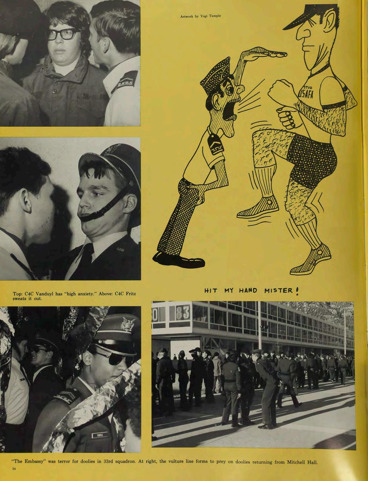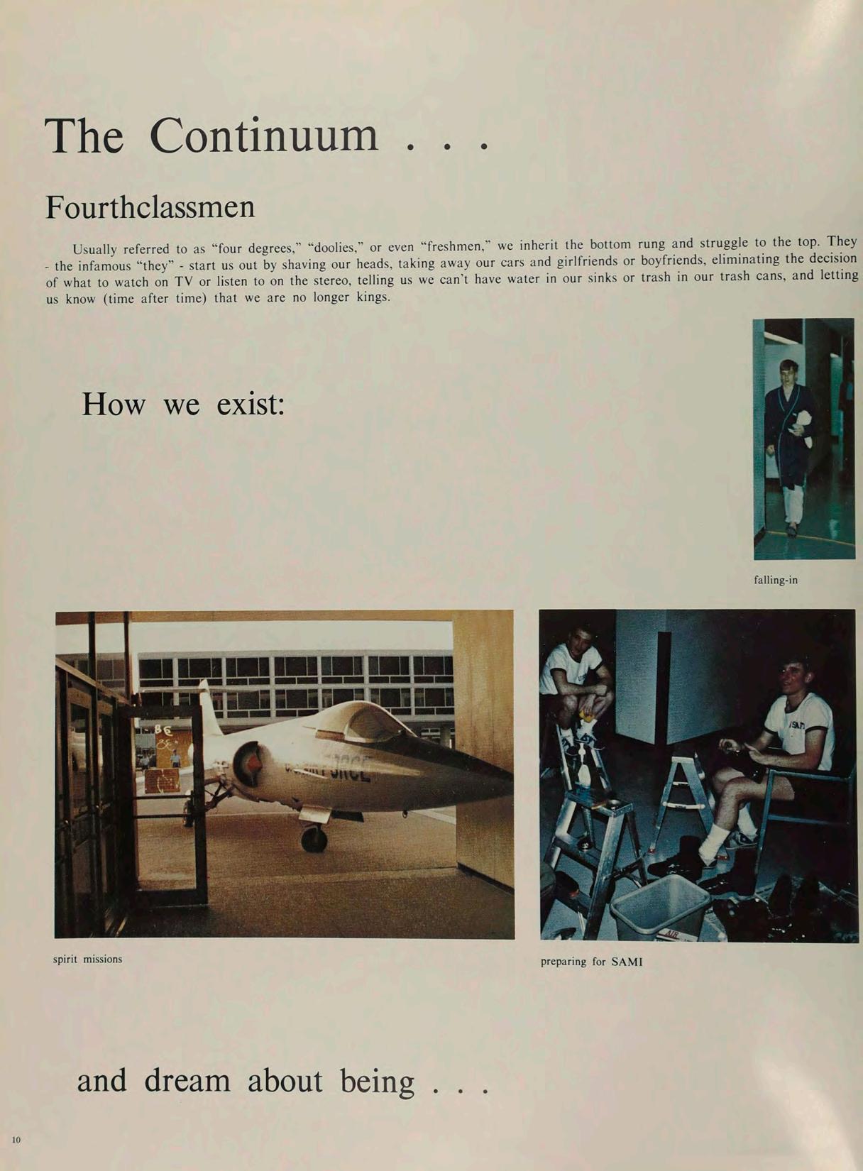 Usually referred to as “four degrees,” “doolies," or even “freshmen, we inherit the bottom rung and struggle to the top. They - the infamous “they” - start us out by shaving our heads, taking away our cars and girlfriends or boyfriends, eliminating the decision of what to watch on TV or listen to on the stereo, telling us we can’t have water in our sinks or trash in our trash cans, and letting us know (time after time) that we are no longer kings.