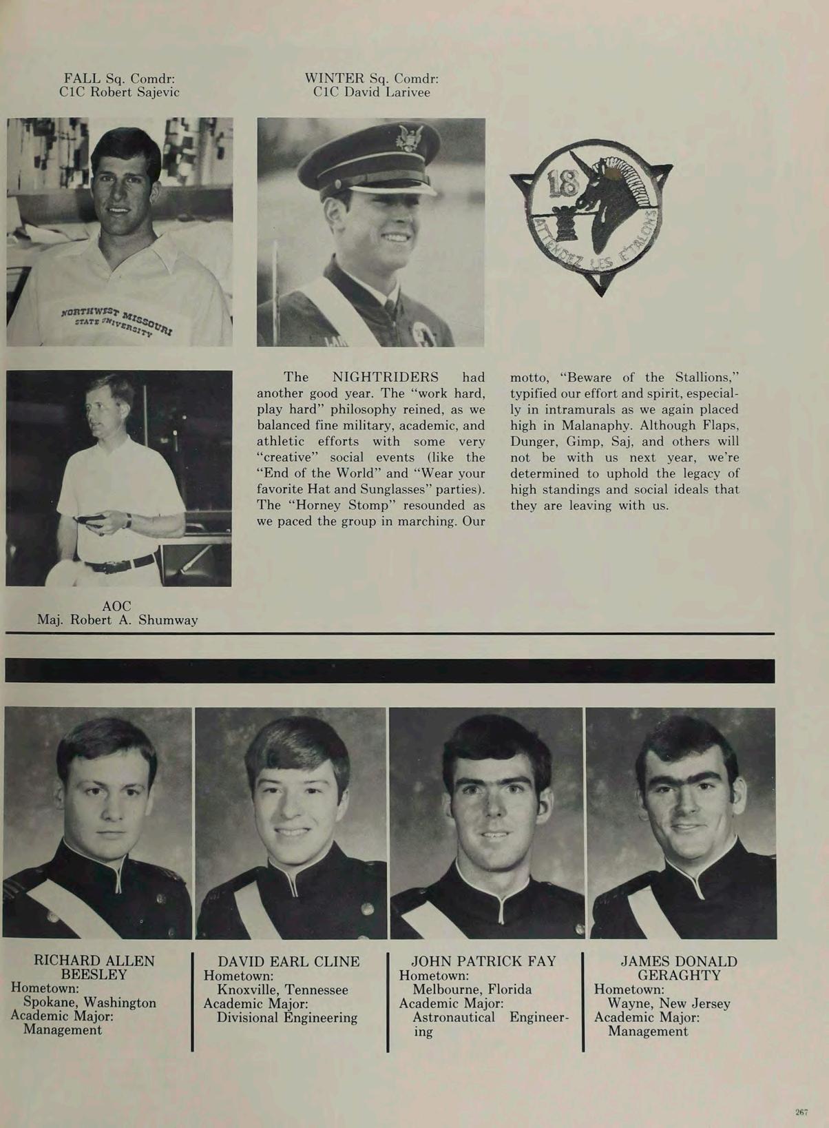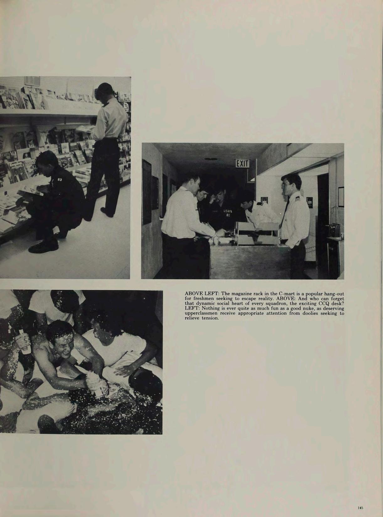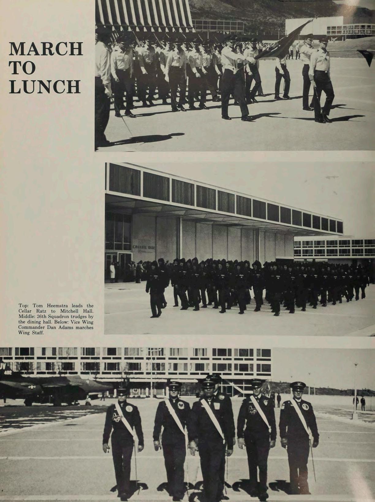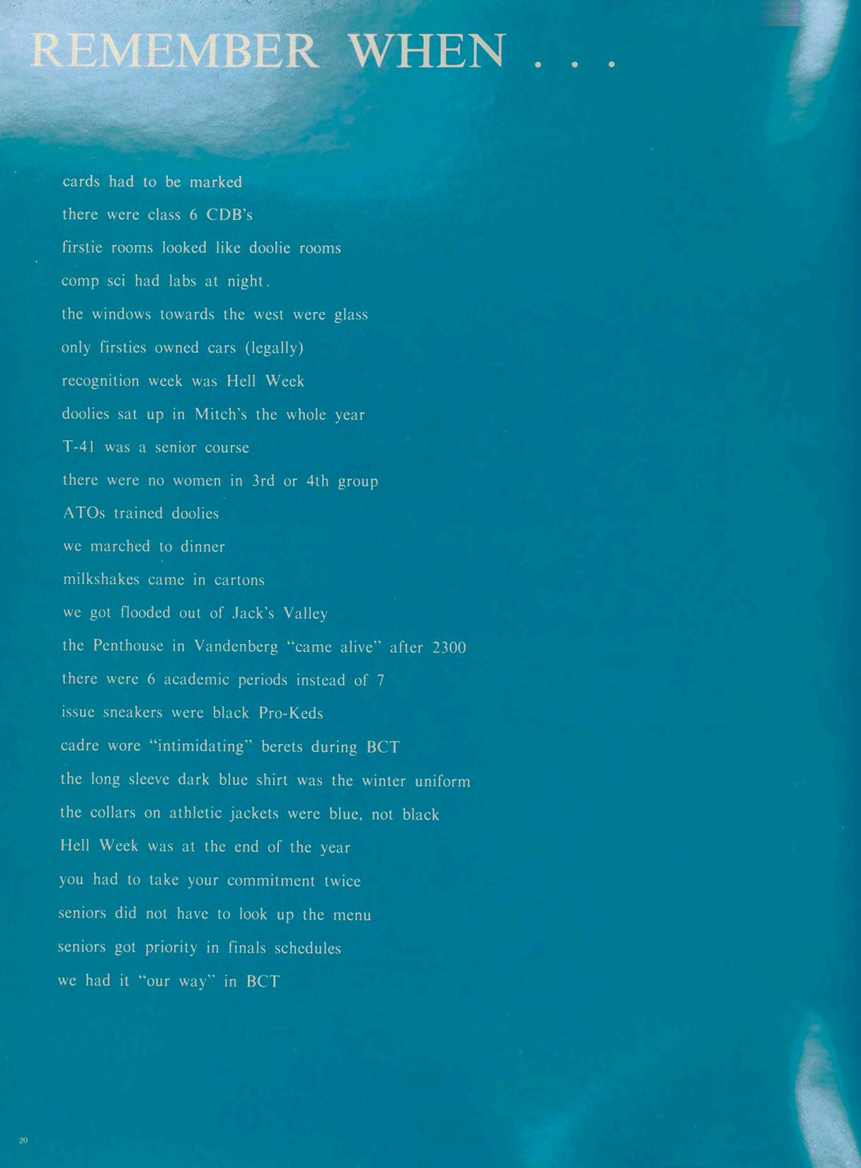 ATOs trained doolies we marched to dinner milkshakes came in cartons we got flooded out of Jack’s Valley the Penthouse in Vandenberg “came alive” after 2300 there were 6 academic periods instead of 7 issue sneakers were black Pro-Keds cadre wore “intimidating” berets during BCT the long sleeve dark blue shirt was the winter uniform the collars on athletic jackets were blue, not black Hell Week was at the end of the year you had to take your commitment twice seniors did not have to look up the menu seniors got priority in finals schedules we had it “our way” in BCT