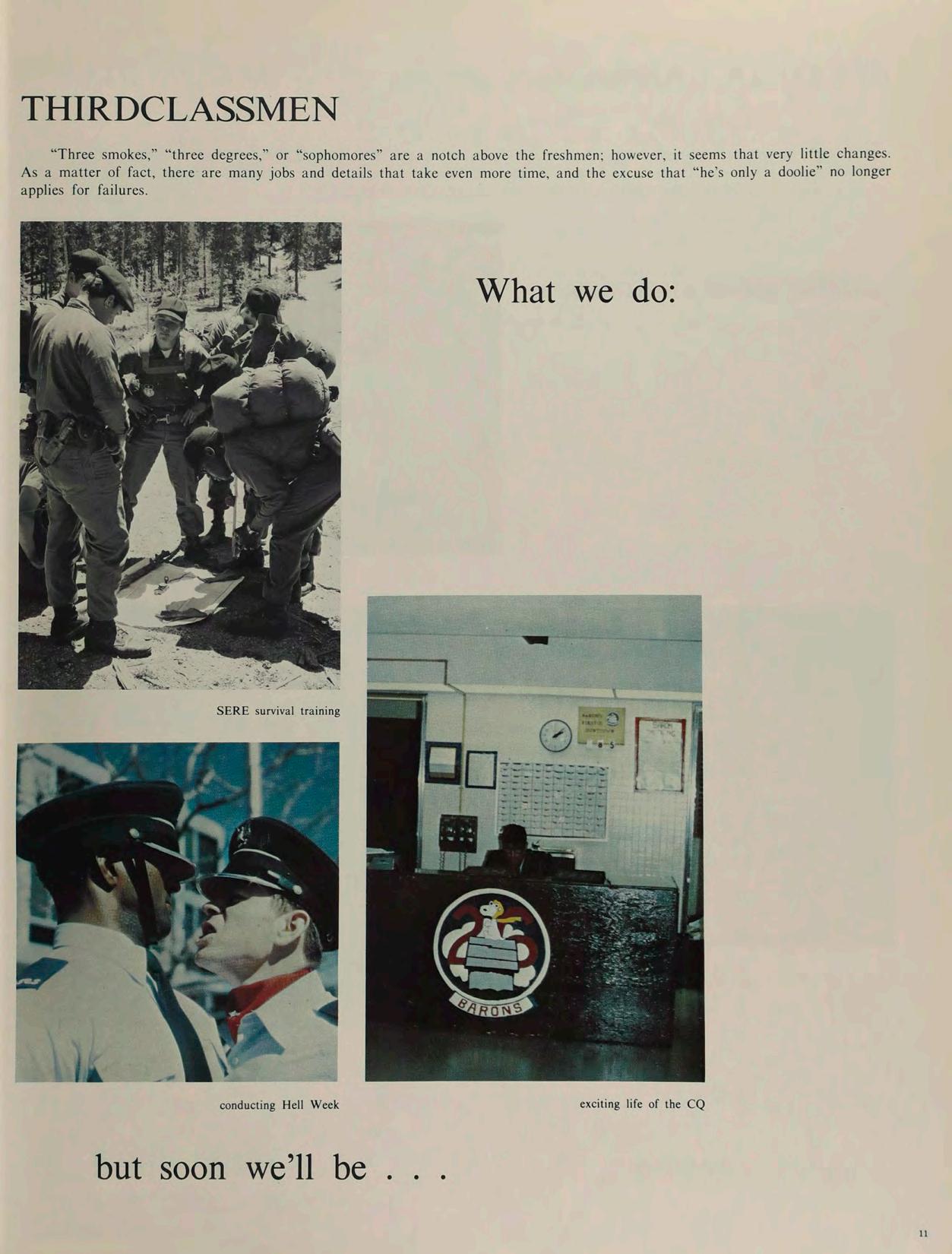 “Three smokes,” “three degrees,” or “sophomores” are a notch above the freshmen; however, it seems that very little changes. As a matter of fact, there are many jobs and details that take even more time, and the excuse that “he’s only a doolie" no longer applies for failures.