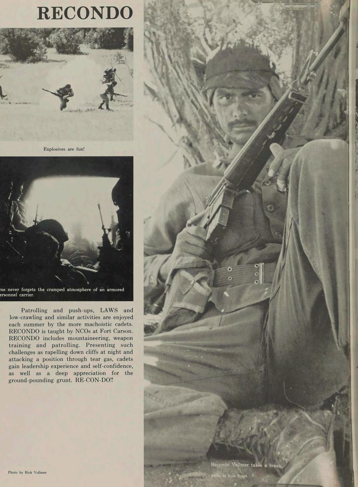 RECONDO includes mountaineering, weapon training and patrolling. Presenting such challenges as rapelling down cliffs at night and attacking a position through tear gas, cadets gain leadership experience and self-confidence, as well as a deep appreciation for the ground-pounding grunt. RE-CON-DO!!