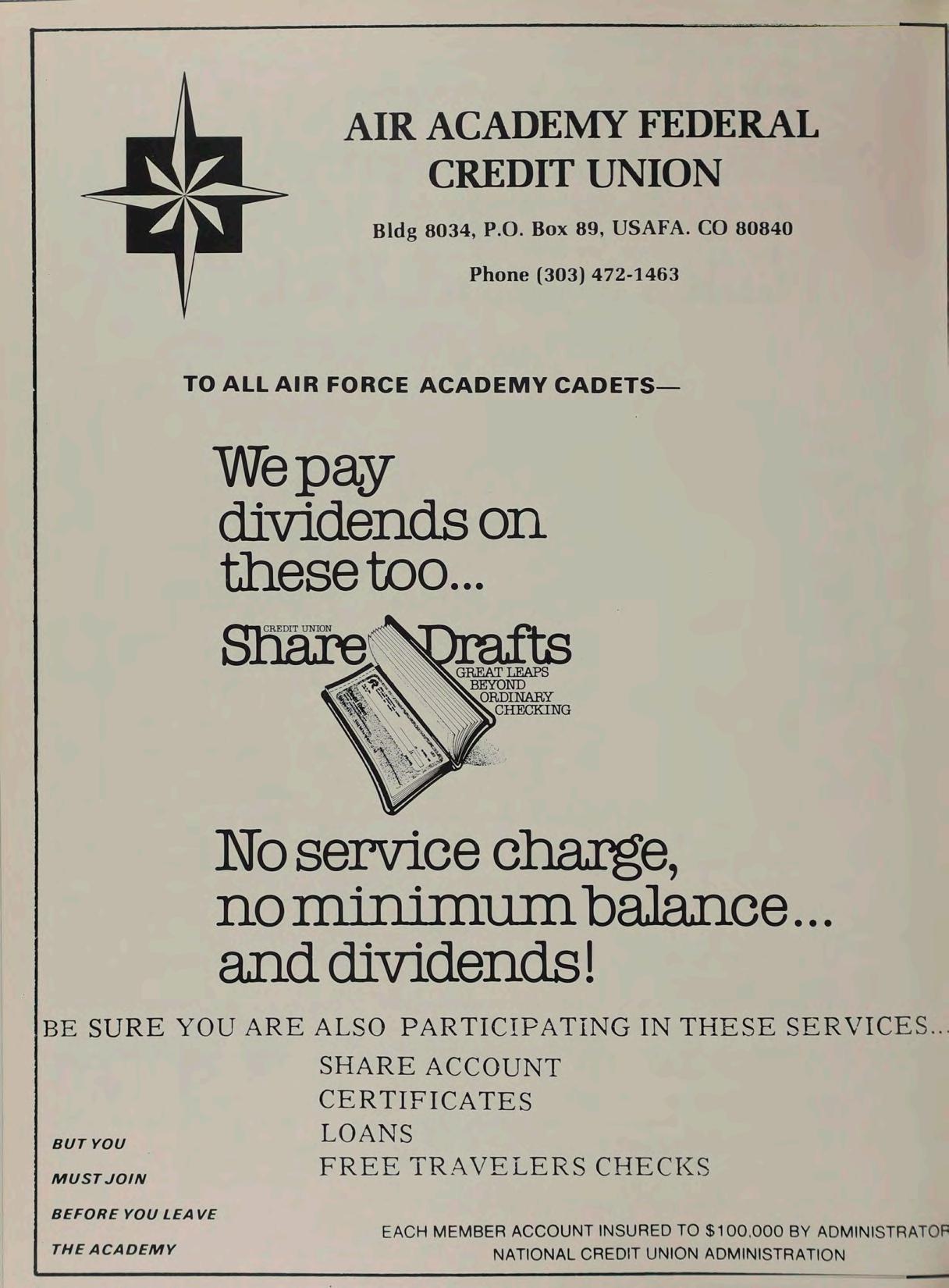 It has been a privilege for USAA to provide the insurance needs of Air Force officers and cadets alike. Today 9 out of 10 officers turn to USAA for their insurance needs. If you’re a cadet, reserve, regular or retired Air Force officer, we invite you to join our elite group. Lor information, call or come by our Colorado Springs office just 5 blocks South of1-25 on Academy Blvd., phone 598-8661. Or call toll free 1-800-531-8080 (in Texas (1-800-292-8080). USAA members call 1-800-531-8+ (your area code). In Texas 1-800-292-8+ (your area code). Or write USAA, USAA Building, San Antonio, Iexas 78288. We’ll be proud to serve you.
