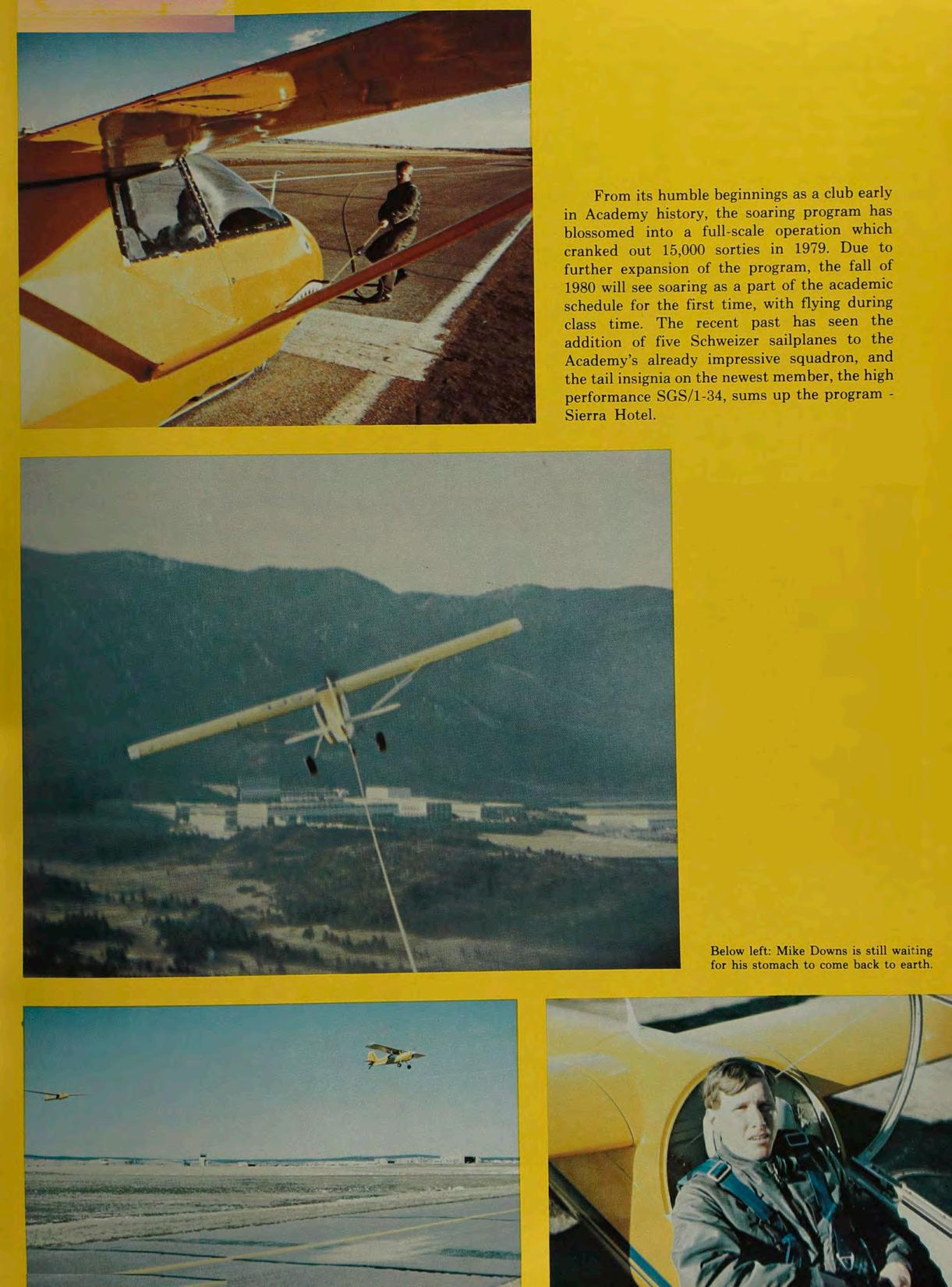 From its humble beginnings as a club early in Academy history, the soaring program has blossomed into a full-scale operation which cranked out 15,000 sorties in 1979. Due to further expansion of the program, the fall of 1980 will see soaring as a part of the academic schedule for the first time, with flying during class time. The recent past has seen the addition of five Schweizer sailplanes to the Academy’s already impressive squadron, and the tail insignia on the newest member, the high performance SGS/1-34, sums up the programSierra Hotel.