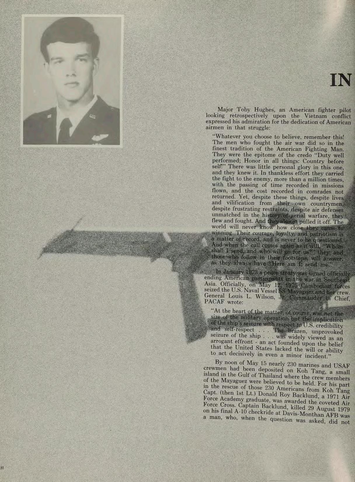 1975, Backlund, and his classmate Lt. Theodore Rand, were named co-recipients of Jabara Award for their part in the Mayaguez incident. Following his tour in Thailand, Capt. Backlund was selected for fixed wing training and given his choice of aircraft to fly. He selected the A-10 stating, “I guess when you get right down to it, I’m a mudslinger at heart and I love the treetops!” Capt. Backlund was selected for promotion to Major 3 years below the zone but died in an aircraft accident on his final A-10 checkride. He left behind his parents, Dr. and Mrs. Donald F. Backlund, two sisters, and a host of devoted friends.