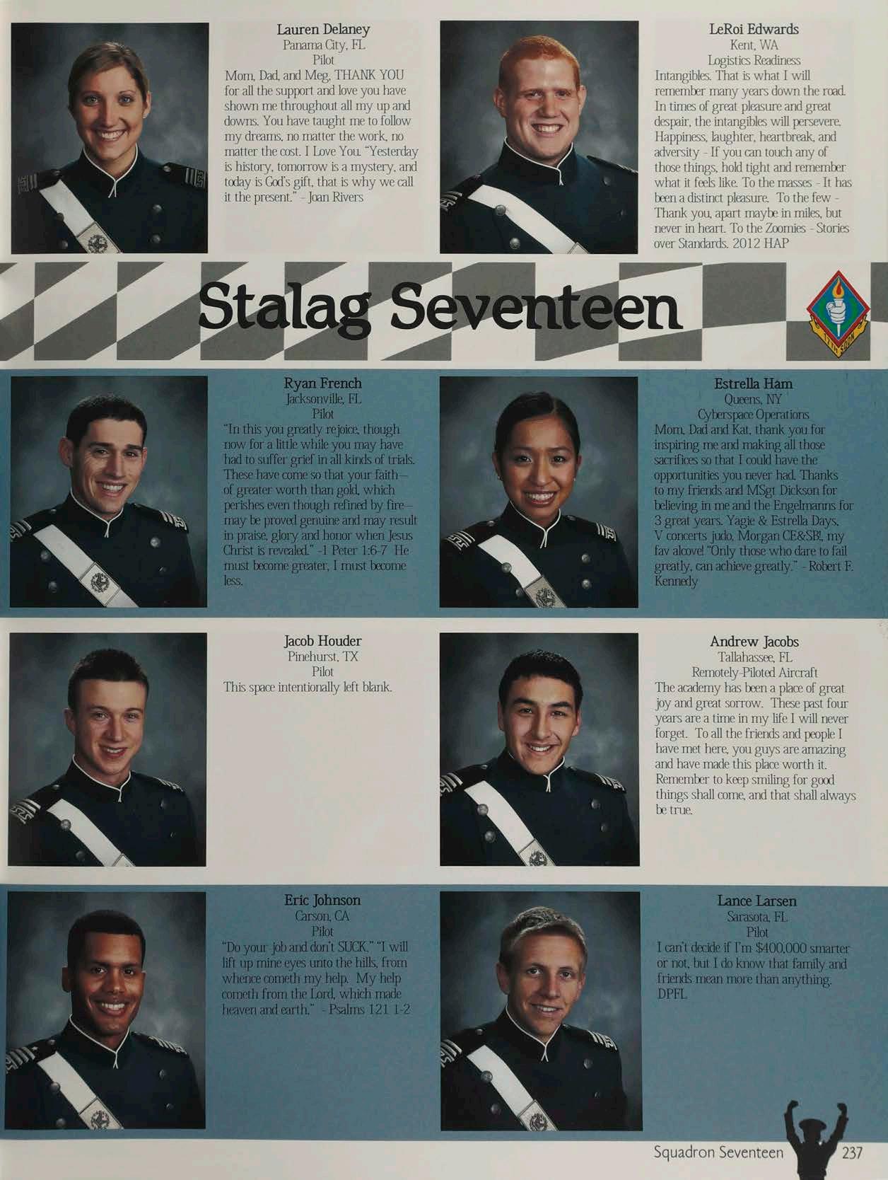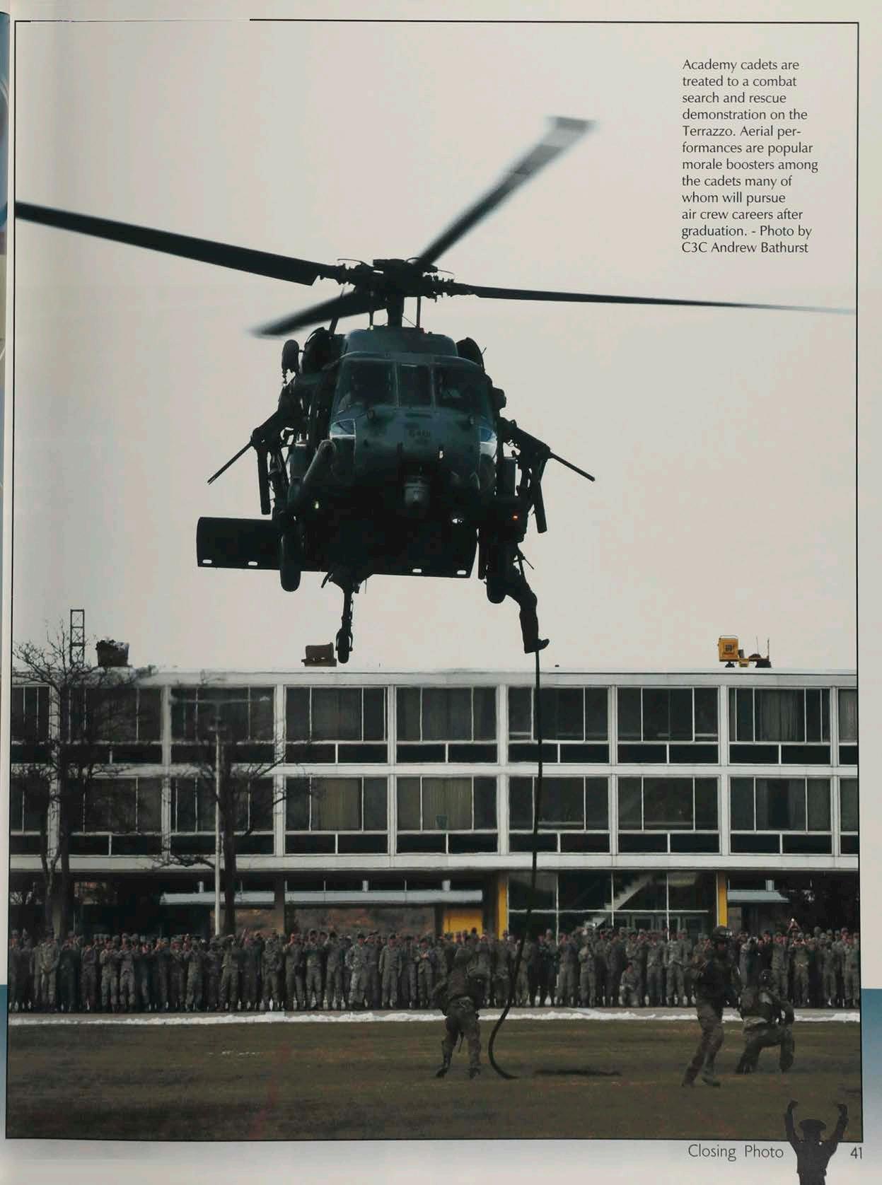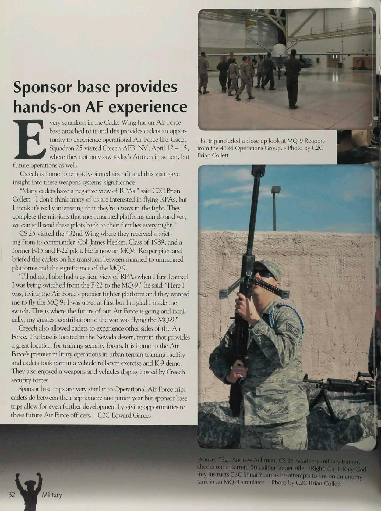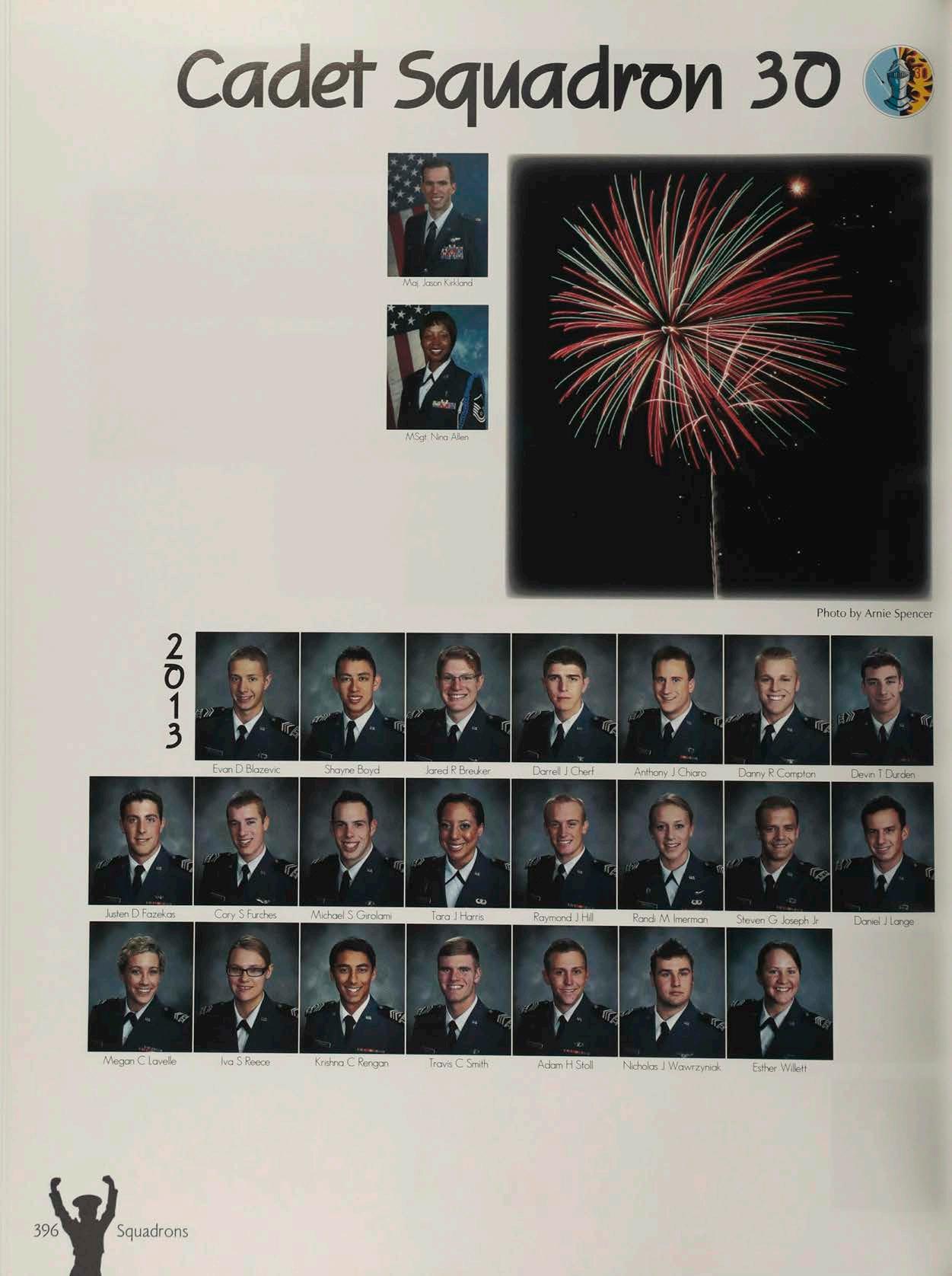 The 2012 Polaris was produced and printed by Walsworth Publishing Company of Marceline, MO, with Greg Stimack Sr. and Greg Stimack Jr. as company representatives. Walsworth designer, Debbie Evert, was responsible for the theme and page designs. Brad Milliman handled editing and writing responsibilities. James “Kimo” Rush was an editor and served as advisor to cadet writers and photographers. Maureen Welch supervised the production process as Chief of Cadet Wing Media.