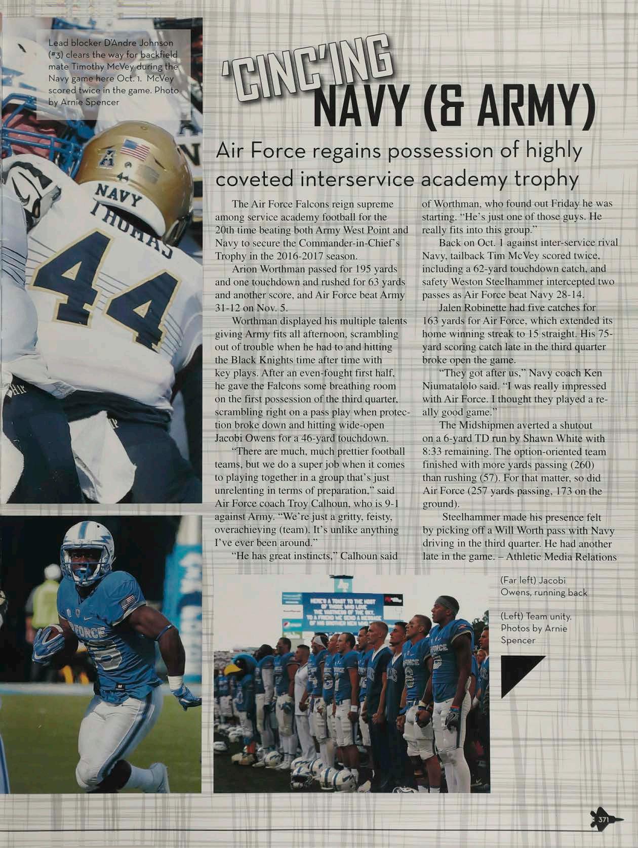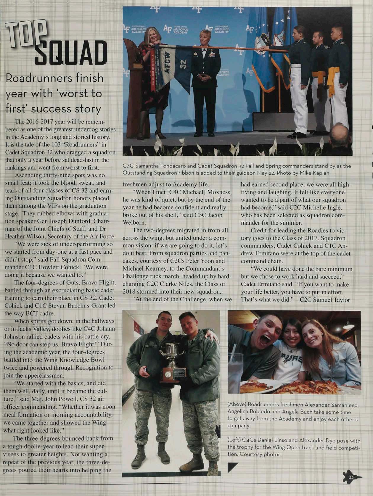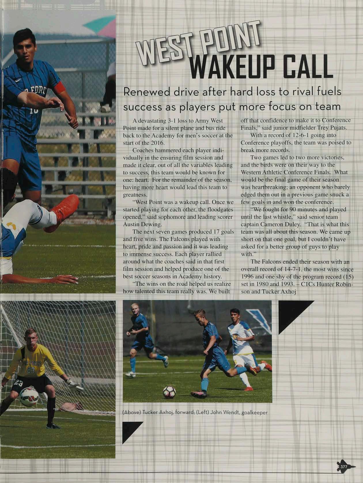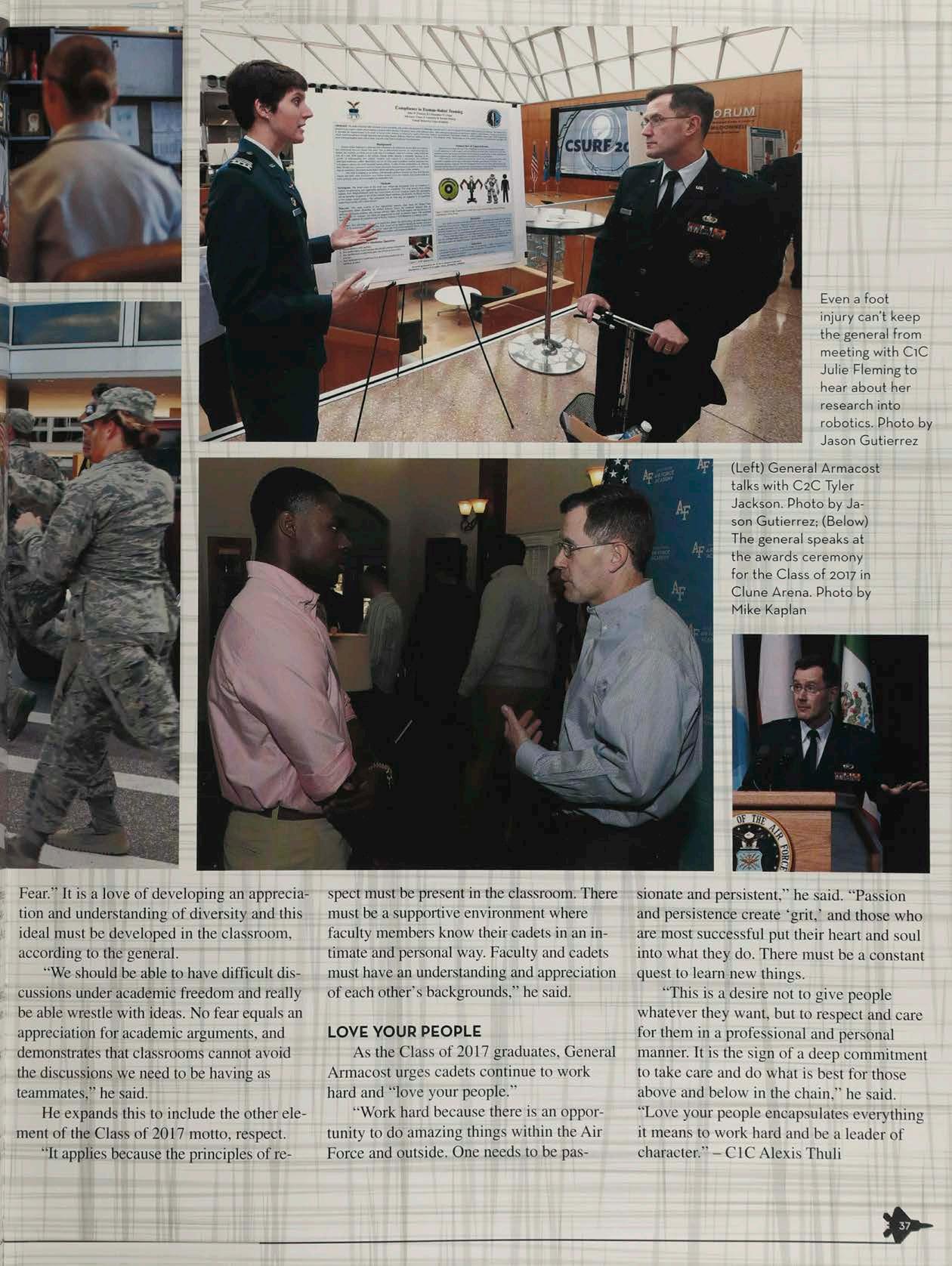 The 2017 Polaris was produced and printed by Walsworth Yearbooks of Marceline, MO, with Greg Stimack as company representative. Walsworth designer, Justin Cantwell, was responsible for theme and page design. U.S. Air Force Academy employees Brad Milliman and James Rush handled editing and served as advisors to cadet writers and photographers. Henry Shaffer supervised the production process as Chief of Cadet Wing Media. 4400 copies of the 201 7 Polaris were printed.