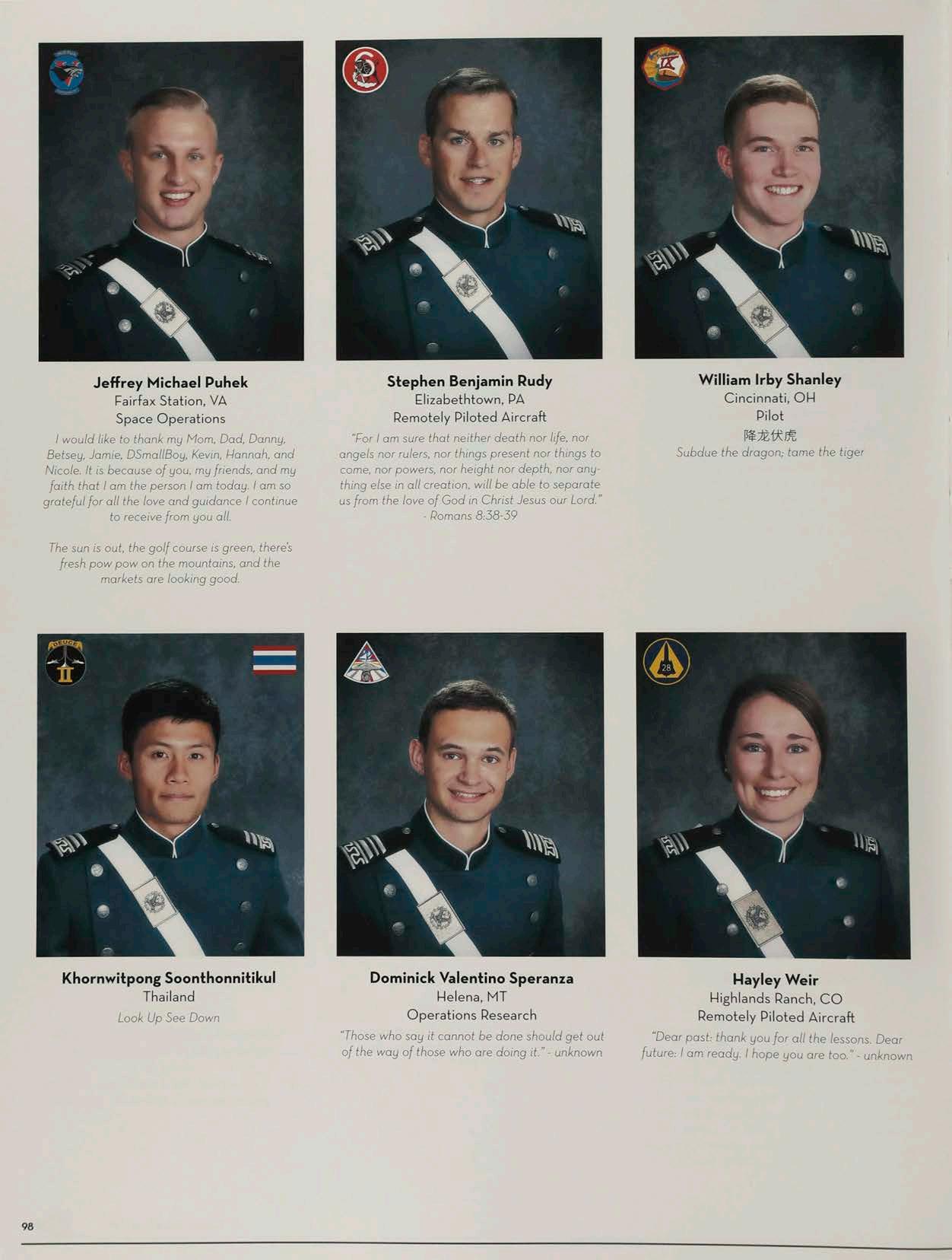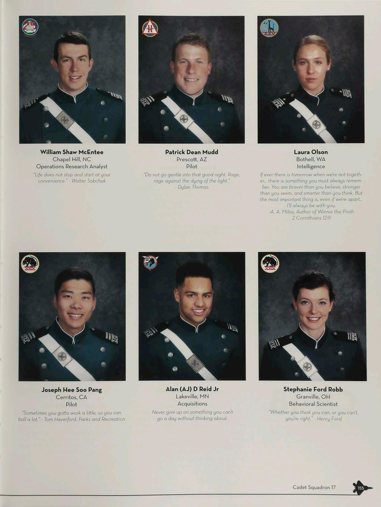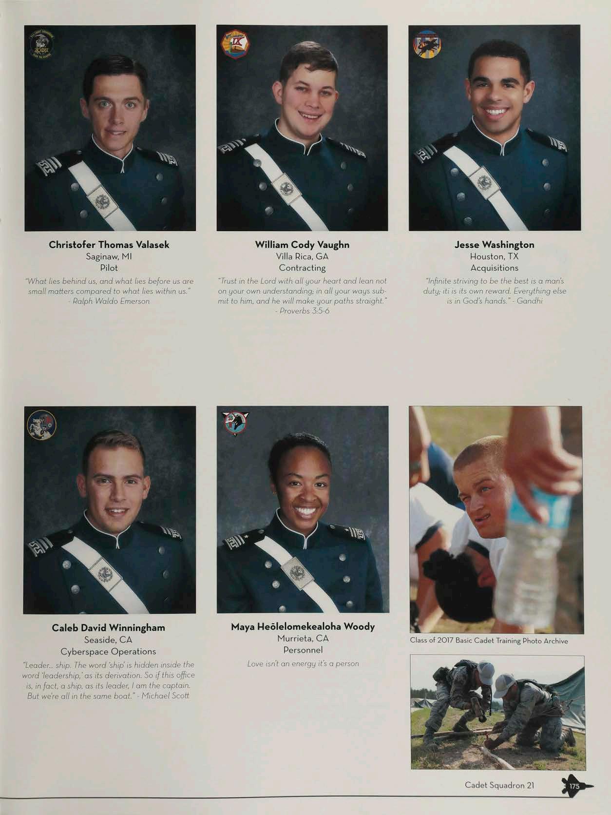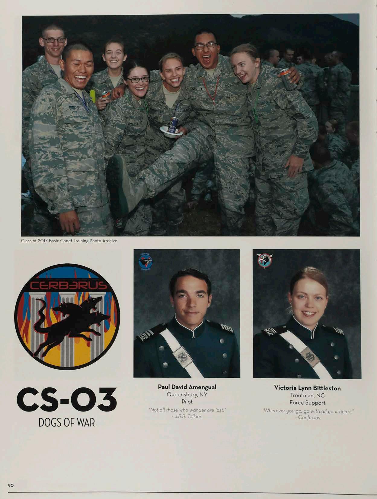 The Class of 2017 has become part of the long blue line. We face goodbyes, uncertainty, and immense responsibility. In this strange new future, we are each a zooming flash of blue lightning - azure, topaz, cerulean, sapphire - that creates the broader landscape of Air Force members before and after us. We began our journey just as any other class and have reached the various markers of a cadet career like any other.