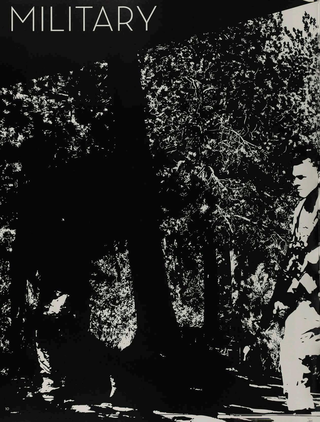 Cover: Custom designed angled quarterbound cover with classic white and rich matte black cover materials. A blind sculptured embossed image of graduating cadets is featured on the front cover. Bright silver hot foil and black silkscreen were used on the front cover and spine