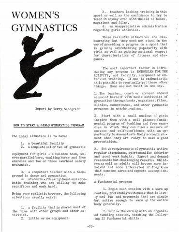 2. Start with a small nucleus of girls inspire them with a well planned fundamental program of tumbling and free exercise in which they can find a measure of success and self-confidence with an opportunity to demonstrate their accomplish ment when they are ready to make a good .presentation. 3. Set up requirements of gymnastic attire regular attendance, sportsmanlike behavior and good work habits. Expect and demand reasonable but challenging results. Children as well as adults will become more involved and more interested if they know that someone cares and expects accomplishments. A fundamental program