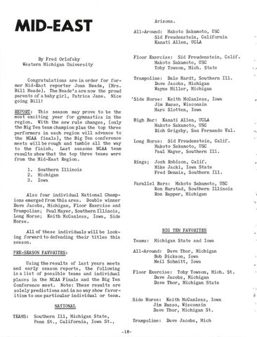 REPORT: This season may prove to be the most exciting year for gymnastics in the regi~n. With the new rule changes, (only the Big Ten team champion plus the top three performers in each region will advance to the NCAA finals), the Big Ten conference meets will be rough and tumble all the way to the finish. Last seasons NCAA team results show that the top three teams were from the Mid-East Region. 1. 2. 3.