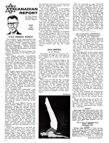 Bill has competed in many Provin cial meets as a junior until 1965. H e then moved up into Senior competition placing 9th in the 1966 Canadian Championships and 8th in the 1967 Pan-Am Trials and was alternate on the Canadian Pan-Am at Winnipe/!. In the 1967 Canad ian Championships, Bill placed 5th All-Round. At present Bill is attending the University of British Columbia in the Faculty of Physical Education: H e is one of the UBC Thunderbirds Col路 leg iate Team who compete throughout the Northwest United States and Western Canada. Bill was on the winning team in the Canad ian National Collegiate Meet. Bill and the team are expecting bi gger and better thin/1:s with their new Coach, Bruno Kl aus at UBC this fall. 1967 CANA DIAN CENTENNIAL TRAMPOLINE CHAMPIONSHIPS AT THE C.N.E., TORONTO The junior men's Canadian championships was won by Paul Bouchard, Montreal. Russel Pierce of Ottawa was second and Steve Levitan of Ottawa was third . In the men's senior Canadian cha mpionshi ps it was Rick Kinsman retaining his title. Wayne King his teammate, second and Gil Larose, better known as a gy mnast was third . ' On Sa turday night in the women's senior open Vicki Bollinger of Springfield, Illin ois placed first and Janet In gram , her cl ub mate, was second. Vicki looked very good , she bounces with authority, control and excellent form. This gi rl has a great future. Over 14 entri es in the Men's Open senior. Many American trampolinists took part. Dave Jacobs, th e present world champion from University of Mich igan; took first. Here is part of his routin e: Pike rudolph out fliffi s, a double back sommy, a double back twisting sommy, 1 % back sommy to a double twisting cody, a barani out to a fliffi s and many more excellent moves. Dave Harlan , also of Michigan, placed seco~d . A very fine trampolinist . . . this boy Will req uire watching, very fin e con trol and natural form. Our local boy, Ri ck Kinsman, placed third , what a fine athlete (placed 3rd All Round in gym nastics the same day). Rick has that desire to excell whi ch is essential for a gymnast or tramp olinist. I just hope we ca n send this very excell ent trampolinist to the World Championships in South Africa. As the meet . chairman for trampolinin g, may I take thiS opportunity to thank the Jud ges and Officials and Me George N issen for the loan of the excell ent trampolines. Judges: Mr. Newt Loken (U of M), Mr. J . Clark (Sprin gfi eld ) ,. Mr. R. IVI unn (N issen ), Me E. Cole (N issen), Me J . Noon ey (Referee), Mr. P eter Rogers (Counter) Mr. L. Martin (Announcer), Me Al War: rick, ( Recorder). RESULTS Open Mens : Dove Jacobs, USA, 9.55 ; Denn IS Harlan , USA, 8 .95; Rick Kinsman Canada , 8 .85; George Huntizerger , USA . 8 .56; Don Portman, USA, 8.00. Senior Mens CI"sed : Ri ck Kinsman , Toronto, 8:75 ; Wayne King, Toronto , 8.40; GIl La Rose, Montreal , 8. 15. Junior Mens Closed : Jean Paul Bouchard Montreal 7 70' Russell Pierce, Ottawa, 7. 10' Steven Lev iton' Ottowa, 6. 10. Senior Open Womens : Vicki Bo l ~ linger, USA 9. 10. Se~lor