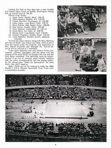 Leading the field all four days was a very durable and steady Joyce Tanac of Seattle, Washington ending with an overall total of 146.10. Official Final Totals: 1. Joyce Tanac , Seattle, Wash. 146.10 2. Kathy Gleason , Buffalo , N.Y. 143.40 3. Coleen Mulvihill, Champaign, III. 141.60 4. Cathy Rigby, Long Beach, Calif. 139.10 . 5. Doris Brause, New Haven, Conn. 138.65 6. Cleo Carver, Seattle, Wash. 137.50 7. Terry Spencer, Carbondale, III. 137. 15 8. Diane Bolin, Fair Oaks, III. 136.75 9. Wendy Cluff, Long Beach, Calif. 136.65 10. Carolyn Pingatore, Seattle, Wash. 135.45 11. Linda Metheny, Olympic Comm . approval (injured) The top teh place winners along with Miss Metheny will train at South Lake Tahoe until Sept. 23rd at which time the squad under the direction arid leadership of Mrs. Mu riel Grossfeld and Manager Mr. Vannie Ed wards will be reduced to 7 members. It was again apparent and very obvious to the contestants , coaches , spectators and the press that the judging of the sport MUST be brought into line and the time factor expedited. This definitely must be accomplished if we are to maintain good friendly relations with the press correspondents and the paying public. As the saving goes "Wake Up Gymnastics" we need them , they don't need us. Again, thank you all for helping to make the 1968 Women 's U.S.A. Olympic Gymnastic Final Trials such a tremendous success.
