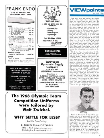 Ye ar aft e r yea r , we publi s h Ihe res ult , of th e s ta te hi g h sc h oo l c hampi on s hips a hout th e co unlr y a nd yea r a ft e r year, the li s t g rows . Thi s year. th e .\1 G brok e w ith its pa s t tra diti on of li s tin g onl y nam es a nd n o scores. Thi s wa s no t ,0 mu c h becau "e th e scores m ea n s o mu ch more . but it is b eca use w e fee l that th e onl y way the "co rin g "ys te m c a n bf' d irected towa rd a m o r e unifo rm pa tt ern is by g ivin g e xam pl es good a nd bad . Th e point , i" no t, howeve r. that Wf' fer l on e syste m is so ri g ht a nd anot he r so w r(l n ~, but th e re ad pr !-' cannin g th ese sco r es wi ll be co nfu se d a s to what sys te m ( ~ , wa~ f we re ) br in g u sed. J5 a sco r e a 9 .2 o r i" it a to tal o f two scor es o r an ave rage o f t wo sco r es. We h a d to s ift throu g h m a n y, man y r e am s of res ult s s h ee ts to pu ll o ut the to p three n a me" . Onl y ,\I ai n e a nd P enn sy lva nia c am e at al l clo"e to fo ll ow in g th e fo rmat we ha vr "u ggps tin g fo r s ubmittin g mee t r es ult s to I h (' '\IG. Of all th e S ta te c h a mpi on "hips. th e Illi · noi s III Pt' 1 St't' Ill S th e Ill ()~ t or.!!anizf'd. Perha ps thi s is beca u;;e th ey s(' nt 'out co mplde r uutin es. :-:cores, a w ril e -up, a nd photfl!". \Ve wo uld lik e to ack n ow lN b :e too, th ose s tat es w hi c h ton k th e tim e to ga th e r ill(' win nin g rout in es toge th e r ; Ihi s form s th e o nl y re a l ba s is fo r co mp a ri son o f gy mn a s ts ac ross Ih e co untr y. P e rhap s a s tim e pa ".l's .. o th e r s tate c h a mpi on s hips wi ll r ecognize Ihat thi s n ut only improves th e ir "n a ti onal s ta ndin g" hut a ls o se r ves a s a va luabl e teaching a nd coachi n l-( ai d. New York. Indi a n a . IIlin u is. and P c nn ~y l va ni a se n t in th e ir winning roulin es a n d we ca u g ht the top ro uim's of th e rnutin es o f th e L A. C it y winn e rs o n a port a hl e tape reco rd e r. I Thi s is a n ot" IV ," so und in hop,'s thai oth e rs w ill adopt il in Ih e fulu n ' .1 Th e Con nec ti c ut S tat e champi· on s hips h ave t's tabli s he d co mpu lso ry l'x(" rc ises. Their s tat e winnt'fs won Ilt'ca use tlw), cn uld do both co mpul sor y and optional " . Thi s, w e feel is a h ea lthy tre nd.