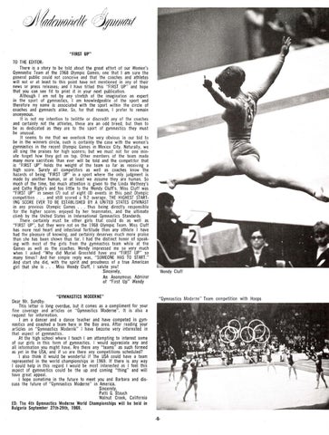 "FIRST UP" TO THE EDITOR: There is a story to be told about the great effort of our Women 's Gymnastic Team at the 1968 Olympic Games; one-that I am sure the general public could not conceive and that the coaches and athletes wi" not or at least to this point have not mentioned in any of their news or press releases ; and I have titled this " FIRST UP" and hope that you can see fit to print it in your next publication. Although I am not by any stretch of the imagination an expert in the sport of gymnastics, I am knowledgeable of the sport and therefore my name is associated with the sport within the circle of coaches and gymnasts alike. So, for that reason, I prefer to rem ain anonymous. It is not my intention to belittle or discredit any of the coaches and certainly not the athletes, these are an odd breed, but then to be as dedicated as they are to the sport of gymnastics they must be unusual. It seems to me that we overlook the very obvious in our bid to be in the winners circle, such is certainly the case with the women's gymnastics in the recent Olympic Games in Mexico Ci ty. Natura"y, we a" sing the prai ses for high scorers; but we must not for one minute forget how they got on top. Other members of the team made many more sacrifices than ever wi" be told and the competitor that is "FIRST UP" holds the weight of the team so far as receiving a high score. Surely a" competitors as we" as coaches know the hazards of being "FIRST UP" in a sport where the only judgment is made by another human, or at least we assume they are human. So much of the time, too much attention is given to the Linda Metheny's and Cathy Rigby's and too little to th e Wendy Cluff's. Miss Cluff was "FIRST UP" in seven (7) out of eight (8) events in this past Olympic competition .. . and still scored a 9.2 average, THE HIGHEST STARTING SCORE EVER TO BE ESTABLISHED BY A UNITED STATES GYMNAST in any previous Olympic Games ... thus being directly respon sib le for the higher scores enjoyed by her teammates, and the . ultimate climb by the United States in International Gymnastics Standards. There certainly must be other girls that could do as we" as " FIRST UP", but they were not on the 1968 Olympic Team. Miss Cluff has more real heart and intestinal fortitude than any athlete I have had the pleasure of knowing, and certainly deserves much more praise than she has been shown thus far. I had the distinct honor of speaking with most of the girls from the gymnastics team while at the Games as we" as the coaches. Wendy impressed me so very much when I asked " Why did Muriel Grossfeld have you "FIRST UP" so many times? And her sim ple reply was, "SOMEONE HAS TO START." And start she did, with the spirit and proud ness of a true American girl that she is ... Miss Wendy Cluff, I salute you! Sincerely, An Anonymous Admirer of "First Up" Wendy "GYMNASTICS MODERNE" Dear Mr. Sundby: This letter is long overdue, but it comes as a compliment for your fine coverage and articles on "Gymnastics Moderne". It is also a request for information. I ~m a dancer and a dance teacher and have competed in gymnastics and coached a team here in the Bay area. After reading your articles on " Gymnastics Modern-e" I have become very interested in that aspect of gymnastics . At the high school where I teach I am attempting to interest some of our girls in this form of gymnastics . I would appreciate any and all information you might have. Are there any "teams" as such formed as yet in the USA, and if so are there any competitions scheduled? I also think it wou ld be wonderful if the USA could have a team represented in the world champions hi ps in 1969. If there is any way I could help in this regard I would be most interested as I feel this aspect of gymnastics could be the up and coming "thing" and will have great appeal. I hope sometime in the future to meet you and Barbara and discuss the future of "Gymnastics Moderne" in America. Sincerely, Patti G. Stauch Walnut Creek, California ED: The 4th Gymnastics Moderne World Championships wi" be held in Bulgaria September 27th路29th, 1969.