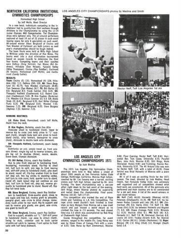 8.60; Floor Exercise, Hector Neff, Taft 8.40; Horizontal Bar, Tom Casey, University 8.35; Parallel Bars, John Kolb, Monroe 8.30; Still Rings, Mark Sherwood, Venice 8.80; and Tumbling, Ronnie Reznick, University 8.55. The All Around title was won by Hector Neff, Taft, with a total of 46.60. Close behind was Brad Horowitz of Monroe with a score of 44.50. All in all it was an exciting finale for the 1971 season. The meet, directed by Jack Medina, Head Coach, San Fernando Valley State, was extremely well organized and all competitors showed what hard work can accomplish. All of the gymnasts who performed and their coaches are to be commended for a job well done. A list of the award winners in each event follows: AA: Neff (Taft) 46.60; Horowitz (Monroe) 44.50; Peterson (Chatsworth) 41.35. FX: Neff 8.4; tie between Rodas (Lincoln and leta (M) 8.2 ; SH: Zim merman (M) 8.6; Varris (Uni) 7.9; Neff 7.8. HB: Casey (Uni) 8.35; tie between Horowitz and Bogden (T) 8.0. LH: Chase (Canoga Park) 8.55 ; Miranda (l) 8.25; Reznick (Uni) 8.1. PB: Kolb (M) 8.3; Horowitz 8.1 ; Neff 7.9. R: Sherwood (Venice) 8.8; laurie (V) 8.55; Yeakey (Grant) 8.05. Tu: Rezni ck 8.55; Casian (M) 8.1; Schatz (Narhonne) 7.8. Rope: Morgan (M) 2.9; King (Chat) 3.3 ; Krueger (South Gate) 3.4.
