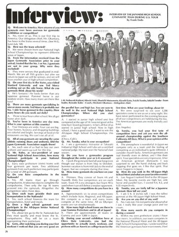 the parallel bars and high bar. You are sure to do well in the next National High School Championships. When did you start gymnastics? A. I started in junior hi g h sc ho o l a nd fir st competed at the age of 14. I was not good at th e tim e but I loved gy mna sti cs . In fac t, a ll five of us started in juni or high sc hoo l. Now in hi g h sc hoo l, I ha ve a good coac h . I want to w in the All-Ja pan Hi g h School Champion ship s thi s yea r. (C hi co, Ca lif.) Q. Mr. Tanaka, what is your occupation? A. I a m a gy mn as ti cs in stru cto r a t Takasak i Indu strial Hi g h School a nd I also am a ce rtified nati o nal judge. My tea m wo n th e Na ti o na l's la st seaso n. Q. Do you have a gymnastics program throughout the entire year or is it seasonal? A. I wo rk th e gy mna sts hard a ll yea r lo ng even thou g h o ur seaso n is from May to October. Summer vaca ti on is from mid-July to th e en d of Augu st, but we co mp e te during th at time. Q. How many gymnasts do you have on your team? A. Thirteen. Th ey co nsist o f Team #A a nd Tea m#B. Onl y fi ve compe tito rs are o n eac h tea m . Tea m #A is my stron ges t, but Tea m #B is use d w he n I ca n still defeat a wea ke r opponent. Q. How many competitions do you have in a season? A. Appro xi ma te ly six to seve n co mp et itions wh ic h in cl ud e Sta te, Reg io nal , and All-Japan. We co mp e te as a tea m a nd ma ny tea ms compete at th e sa m e tim e. All six Ol ym pi c events a re run Simult a n eous ly. Q. How many high school teams are there in your Gumma Prefecture and in all of Japan? A. The re are a ppro xim a te ly 20 tea m s in Gumma a nd ove r 1,000 in Japa n. Q. During your second exhibition here at Chico State University, you had the opportunity to actually meet, workout, and perform with an American college team for the