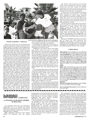 or Gymnastics on the Beach at Waikiki by Dick Criley The Honolulu City Parks and Recreation Department (P & R) invit ed the' H awa ii Gymnastics Association (HGA) to take part in their annua l Summer Festival june 23 & 24 in Kapiolani Park in Waikiki. With equ ipm e nt loaned " by the Central YMCA of Hon o lulu and the kokua