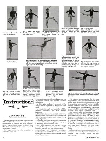 This month, let us exa mine th e lirst two requirements. Since pi ctures speak b etter than words, here are photos of gymnasts balancing in some of th e co mmon body position s used by dan ce rs for turn s. On ce these bas ic position s are mastered, they can be modified to a ce rtain ex tent with different arm and head positions to achi eve a more suppl e "gymnasti c" style. It is essential th at th e weight be ce ntered directly over th e ball of th e support foo t. Any sli ght devi ation wil l ca u se the body to lose bal ance in th e direction that th e we ight went. So man y thin gs ca n happ en to thr o w this off. It is ex tremely important to understand proper body ali gnment in al l th e turning pos itions and to practice balancin g in th ese positi o ns. Thi s is one pla ce wh ere pr acti ce w ill NOT mak e perfect, unl ess yo u kn ow exactl y what yo u are doing. H ere are photos of gym nas ts showing th e co mmon errors in alignment mad e in each position . Th e captions below are self exp lanat o ry.