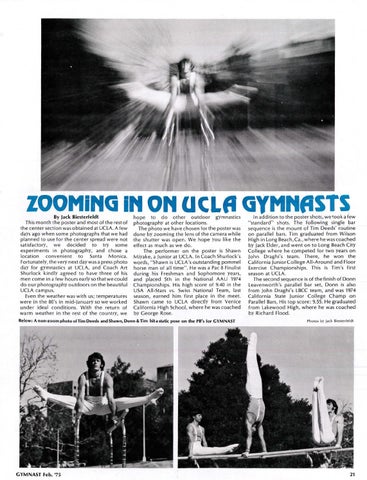 By Jack Biesterfeldt This month the poster and most of the rest of the center section was obtained at UCLA. A few days ago when some photographs that we had planned to use for the center spread were not satisfactory, we decided to trY some experiments in photographY, and chose a location convenient to Santa Monica. FortunatelY, the very next day was a press photo day for gymnastics at UCLA, and Coach Art Shurlock kindly agreed to have three of his men come in a few hours early so that we could do our photography outdoors on the beautiful UCLA campus. Even the weather was with us; temperatures were in the 80' s in mid-January so we worked under ideal conditions. With the return of warm weather in the rest of the country, we