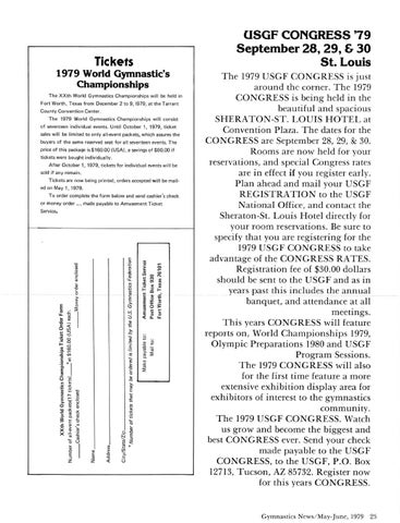 The 1979 USGF CONGRESS is just around the corner. The 1979 CO N GRESS is being held in the beautiful and spacious SHERATON-ST. LOUIS HOTEL at Convention Plaza. The dates for the CONGRESS are September 28, 29, & 30. Rooms are now held for your reservations, and special Congress rates are in effect if you register early. Plan ahead and mail your USGF REGISTRATION to the USGF National Office, and contact the Sheraton-St. Louis Hotel directly for your room reservations. Be sure to specify that you are registering for the 1979 USGF CONGRESS to take advantage of the CONGRESS RATES. Registration fee of $30.00 dollars should be sent to the USGF and as in years past this includes the annual banquet, and attendance at all meetings. This years CONGRESS will feature reports on, World Championships 1979, Olympic Preparations 1980 and USGF Program Sessions. The 1979 CO N GRESS will also for the first time feature a more extensive exhibition display area for exhibitors of interest to the gy~nastics community. The 1979 USGF CONGRESS. Watch us grow and become the biggest and best CONGRESS ever. Send your check made payable to the USGF CONGRESS, to the USGF, P.O. Box 12713, Tucson, AZ 85732. Register now for this years CONGRESS.