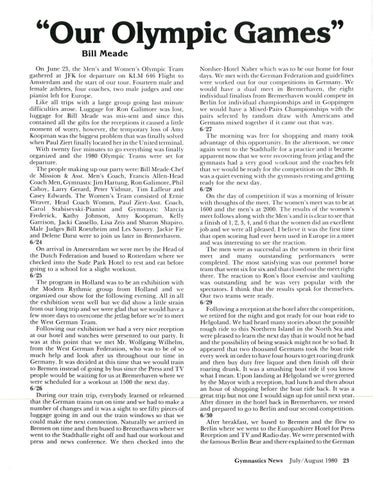 "Our Olympic Games" Bill Meade On June 23, the Men 's and Women 's Olympic Team gathered at JFK for depa rture on KLM 646 Flight to Amsterdam and th e start of our tour. Fourteen male and female athletes, four coaches, two male judges and one pianist left for Europe. Like all trips with a large group going last minute difficulties arose. Luggage for Ron Galimore \.Vas lost, luggage for Bill Meade was mis-sent and since this contained all the gifts for the receptions it caused a liule moment of worry, however, the temporary loss of Arny Koopman was the biggest problem that was fin a ll y solved when Paul Zien finally located her in the U nited terminal. With twenty five minutes to go eve rything was finall y organized and the 1980 Olympic T ea ms were set for departure. The peopl e making up our party were: Bill Meade-Chef de Mission & Asst. Men 's Coach, Francis Allen-Head Coach Men, Gymnasts: Jim Hartung, Ron Galimore, Phil Cahoy, Larry Gerard, Peter Vidmar, T im Lafleur a nd Casey Edwards. The Women's T eam co nsisted of Ernie Weaver, H ead Coach Women, Pa ul Ziert-Asst. Coa ch, Carol Stabisevski-Pianist and Gymnasts: Marcia Frederick, Kathy Johnson , Amy Koopm an, Kell y Garrison, Jacki Cassello, Lisa Zeis and Sharon Shapiro. Male Judges .Bill Roetzheirn and Les Sasvery. Jackie Fie and Delene Darst were to join us later in Bremerhaven.