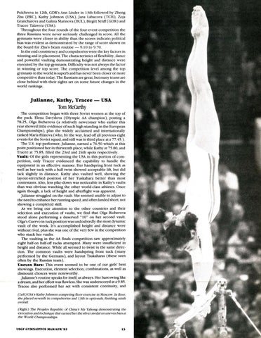 Polchrova in 12th, GDR's Ann Linder in 13th followed by Zheng Zhu (PRC), Kathy Johnson (USA), Jana Labacova (TCH), Zoja Grancharova and Galina Marinova (BUL), Birgitt Senff(GDR) and Tracee Talavera (USA). Throughout the four rounds of the four-event competition the three Russians were never seriously challenged in score. All the gymnasts were closer in ability than the scores indicate; political bias was evident as demonstrated by the range of score shown on the board for Zhu's beam routine - 9.10 to 9.70. In the end consistency and compulsories were the key factors in winning and in placement. The characteristics of flexibility, dance and powerful vaulting demonstrating height and distance were executed by the top gymnasts. Difficulty was not always the factor in winning or top score. The competition level among the top gymnasts in the world is superb and has never been closer or more competitive than today. The Russians are great, but many teams are close behind with their sights set on some future changes in the world rankings.