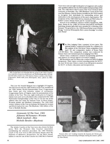 Awards This year the Awards Banquet was a highlight of Congress. The dais was set with the 1983 Athletes of the Year, members of the 1983 Artistic World Championship Team, Congressman Stan Parris and Chic Johnson, master of ceremonies. Congressman Parris, of Virginia, made the presentations of the Athlete of the Year. ll1is year, eight weeks prior to Congress, ballots were sent out to all athletes who competed in the 1983 McDonalds Championships of the USA, to vote for one of the athletes who had made the National Team. In Mens Artistic, Womens Artistic and Rhythmic Gymnastics. The 1983 USGF Artistic Athletes of the Year are Julianne McNamara for women and Mitch Gaylord for men. The Rhythmic 1983 Athlete of the Year is Michelle Berube.