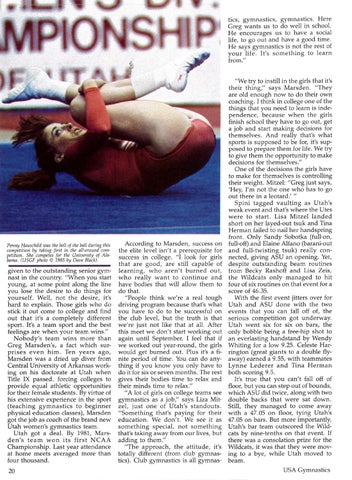 "We try to instill in the girls that it's their thing," says Marsden . "They are old enough now to do their own coaching. I think in college one of the things that you need to learn is independence, because when the girls finish school they have to go out, get a job and start making decisions for themselves. And really that's what sports is supposed to be for, it's supposed to prepare them for life . We try to give them the opportunity to make decisions for themselves ." One of the decisions the girls have to make for themselves is controlling their weight. Mitzel: "Greg just says, 'Hey, I'm not the one who has to go out there in a leotard .' " Spini tagged vaulting as Utah's weak event and that's where the Utes were to start. Lisa Mitzel landed short on her layed-out tsuk and Tina Herman failed to nail her handspring front. Only Sandy Sobotka (full-on, full-off) and Elaine Alfano (barani-out and full-twisting tsuk) really connected, giving ASU an opening. Yet, despite outstanding beam routines from Becky Rashoff and Lisa Zeis, the Wildcats only managed to hit four of six routines on that event for a score of 46 .35. With the first event jitters over for Utah and ASU done with the two events that you can fall off of, the serious competition got underway. Utah went six for six on bars, the only bobble being a free-hip shot to an everlasting handstand by Wendy Whiting for a low 9.25. Celeste Harrington (great giants to a double flyaway) earned a 9.55, with teammates Lynne Lederer and Tina Herman both scoring 9.5 . It's true that you can't fall off of floor, but you can step out of bounds, which ASU did twice, along with two double backs that were sat down. Still, they managed to come away with a 47.05 on floor, tying Utah's 47.05 on bars. But more importantly, Utah's bar team outscored the Wildcats by nine-tenths on that event. If there was a consolation prize for the Wildcats, it was that they were moving to a bye, while Utah moved to beam. USA Gymnastics