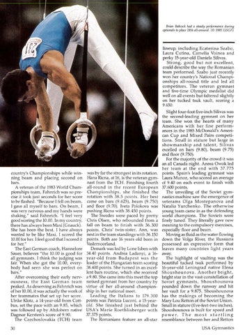 lineup, including Ecaterina Szabo, Laura Cutina, Camelia Voinea and perky 15-year-old Daniela Silivas. Strong, good bu t not excellen t, could describe the way the Romanian team performed. Szabo just recently won her country's National Championships all-round title and led all competitors . The veteran gymnast and five-time Olympic medalist did well on all events but faltered slightly on her tucked tsuk vault, scoring a 9.650.