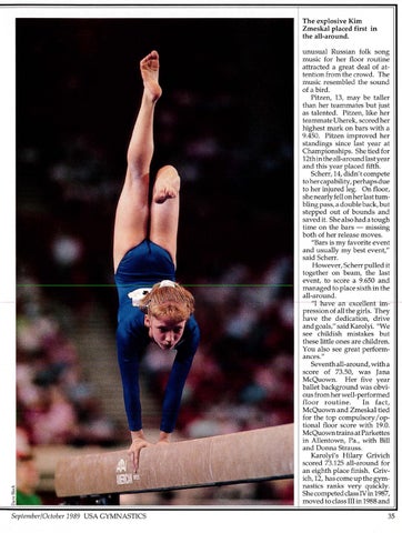 The explosive Kim Zmeskal placed first in the all-around. unusual Russian folk song music for her floor routine attracted a great deal of attention from the crowd. The music resembled the sound of a bird. Pitzen, 13, may be taller than her teammates but just as talented. Pitzen, like her teammate Uherek, scored her highest mark on bars with a 9.450. Pitzen improved her standings since last year at Championships. She tied for 12th in the all-around last year and this year placed fifth . Scherr, 14, didn't compete to her capability, perhaps due to her injured leg. On floor, she nearly fell on her last tumbling pass, a double back, but stepped out of bounds and saved it. She also had a tough time on the bars - missing both of her release moves. "Bars is my favorite event and usually my best event," said Scherr. However, Scherr pulled it together on beam, the last event, to score a 9.650 and managed to place sixth in the all-around. pression of all the girls. They have the dedication, drive and goals," said Karolyi. "We see childish mistakes but these little ones are children. You also see great performances." Seventh all-around, with a score of 73.50, was Jana McQuown. Her five year ballet background was obvious from her well-performed floor routine . In fact, McQuown and Zmeskal tied for the top compulsory / optional floor score with 19.0. McQuown trains at Parkettes in Allentown, Pa., with Bill and Donna Strauss. Karolyi's Hilary Grivich scored 73.125 all-around for an eighth place finish. Grivich,12, has come up the gymnastics ranks very quickly. She competed class IV in 1987, moved to class III in 1988 and