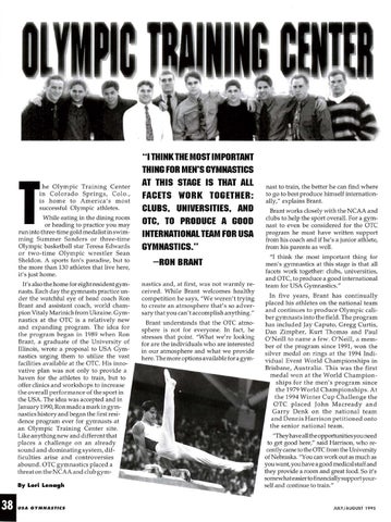 "I THINK THE MOST IMPORTANT THING FOR MEN'S GYMNASTICS AT THIS STAGE IS THAT ALL FACETS WORK TOGETHER: CLUBS, UNIVERSITIES, AND OTC, TO PRODUCE A GOOD INTERNATIONAL TEAM FOR USA GYMNASTICS. " -RON BRANT nastics and, at first, was not warmly received. While Brant welcomes healthy competition he says, "We weren't trying to create an atmosphere that's so adversary that you can't accomplish anything." Brant understands that the OTC atmosphere is not for everyone. In fact, he stresses that point. "What we're looking for are the individuals who are interested in our atmosphere and what we provide here. The more options available for a gym-