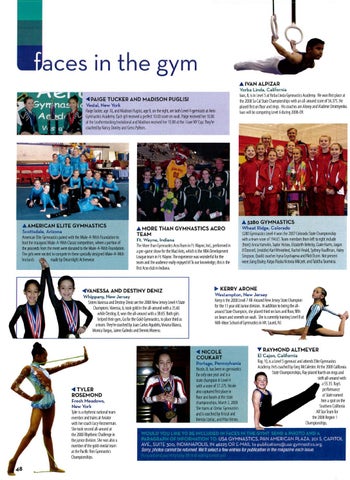 AND DESTINV DENIZ Whippany, New Jersey Sisters Vanessa and Destiny Deniz are the 2008 New Jersey level 4State Champions. Vanessa, 6, took gold in the all-around with a35.60 while Destiny, 8, won the all-around with a38.65. Both girls helped their gym, Go for the Gold Gymnastics, to place third as ateam. They're coached by Juan Carlos Agudelo, Viviana Blanco, Monica Vargas, Jaime Galindo and Dennis Moreno.