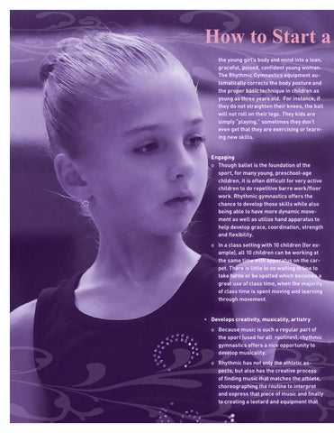 • Engaging o Though ballet is the foundation of the sport, for many young, preschool-age children, it is often difficult for very active children to do repetitive barre work/floor work. Rhythmic gymnastics offers the chance to develop those skills while also being able to have more dynamic movement as well as utilize hand apparatus to help develop grace, coordination, strength and flexibility. o In a class setting with 10 children (for example), all 10 children can be working at the same time with apparatus on the carpet. There is little to no waiting in line to take turns or be spotted which becomes a great use of class time, when the majority of class time is spent moving and learning through movement. • Develops creativity, musicality, artistry o Because music is such a regular part of the sport (used for all routines), rhythmic gymnastics offers a nice opportunity to develop musicality. o Rhythmic has not only the athletic aspects, but also has the creative process of finding music that matches the athlete, choreographing the routine to interpret and express that piece of music and finally to creating a leotard and equipment that