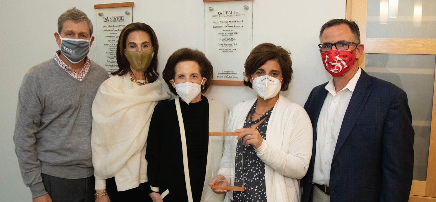 Above: Jennifer M. Scalici, M.D., second from right, receives the Mayer Mitchell Award for Excellence in Cancer Research, A physician-scientist, Scalici serves as chief of gynecologic oncology service at the Mitchell Cancer Institute.