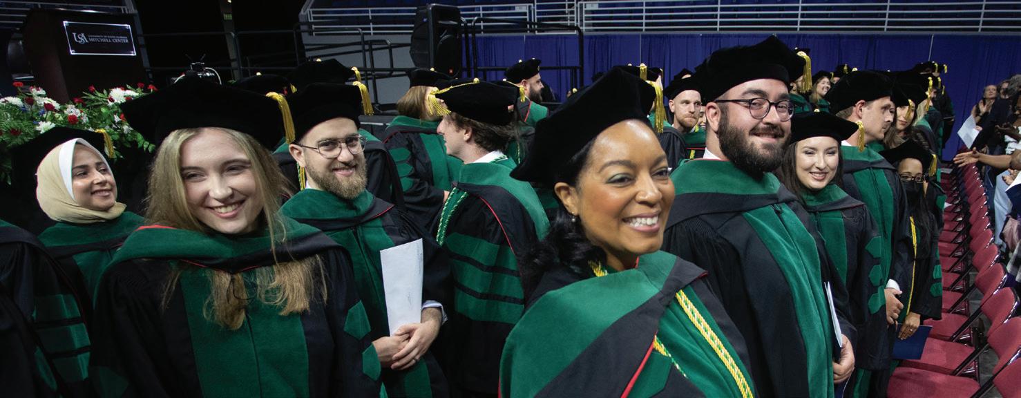 The Frederick P. Whiddon College of Medicine held its 2022 Academic Hooding Ceremony on Thursday, May 5, at the Mitchell Center. Seventy-six medical students took the Hippocratic Oath and were hooded by a person of their choosing. Those with a military affiliation took the military oath of office and received their new rank. Two graduating doctoral students in basic medical sciences were awarded doctoral hoods by their major professors.
