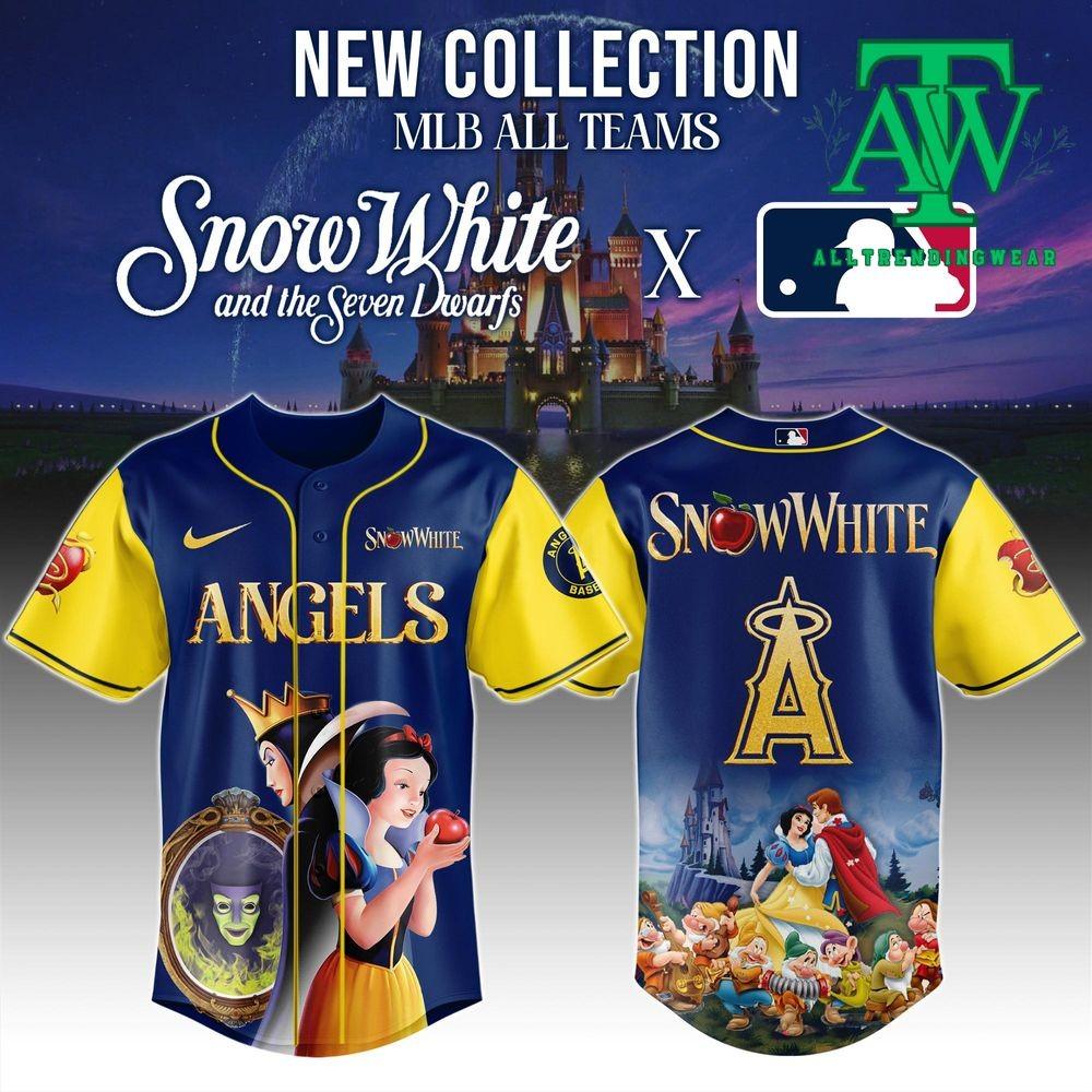The Athletics MLB x Snow White Baseball Jersey 2025 showcases an incredible blend of iconic imagery from Disney’s Snow White and the Seven Dwarfs with the sleek, sporty design of a professional baseball jersey. The front of the jersey features Snow White herself, captured in a stunning scene with her iconic red apple, while the Queen is featured in her evil form, adding an edgy contrast to the magical vibe. This eye-catching design is completed with the bright yellow sleeves that stand out, creating a dynamic visual contrast with the deep blue of the rest of the jersey. The word “Angels” is emblazoned across the chest in bold, luxurious gold lettering, lending the jersey an air of prestige while showing support for the MLB team.