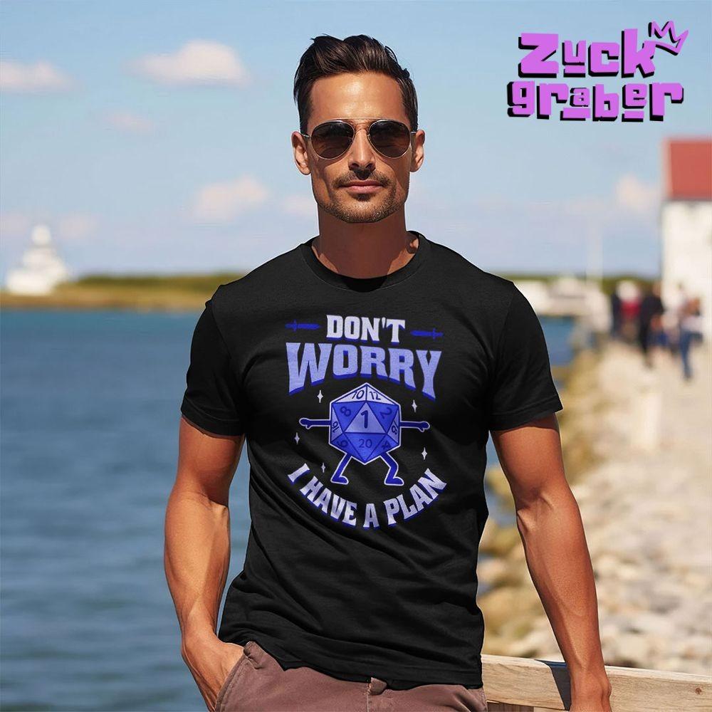 On a sunny afternoon by the seaside, Jake stood proudly wearing his Don’t Worry I Have A Plan Premium Shirt, a black T-shirt that had become a symbol of camaraderie in his local Dungeons & Dragons (D&D) community. The shirt featured a bold design: a blue D20 die, the iconic 20-sided die used in D&D, depicted as a dancing character with sparkles around it. Above the die, the words “DON’T WORRY” were printed in large, white capital letters, while below, “I HAVE A PLAN” curved in a playful blue font, matching the die’s vibrant hue. The design perfectly captured the spirit of D&D—spontaneity, strategy, and a dash of humor. Jake had bought the shirt from a small online store specializing in nerd-culture apparel, and it quickly became more than just a piece of clothing; it was a badge of honor for him and his friends. Every Saturday, they gathered at the community center for D&D sessions, and Jake’s shirt turned into a running joke. Whenever a game plan went awry— whether a dragon nearly wiped out their party or a trap left them scrambling— Jake would point to his shirt, grin, and say, “Don’t worry, I have a plan!” The phrase never failed to lift the group’s spirits, transforming tense moments into shared laughter. The shirt’s influence soon spread beyond their small circle. At a local charity sports event, Jake wore it while leading a D&D-inspired relay race, where teams solved puzzles to “defeat” a mock dragon. The shirt’s message inspired confidence, encouraging teamwork and creative problemsolving. Before long, others in the community started ordering their own Don’t Worry I Have A Plan Premium Shirts, turning it into a symbol of unity, resilience, and the joy of shared adventures—both on the game table and in real life.