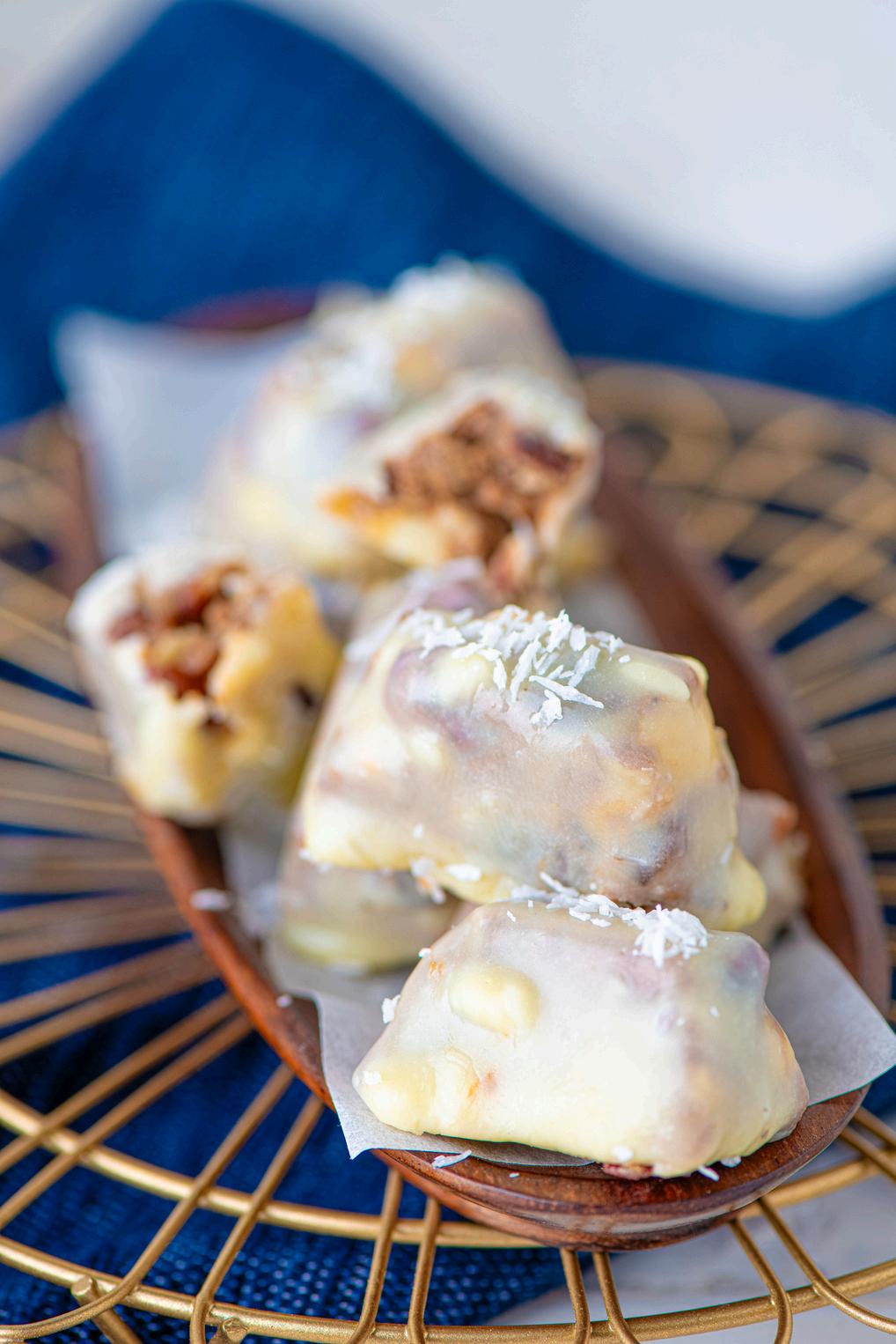Die geschmolzene weiße Schokolade etwas abkühlen lassen, die tiefgekühlten Würfel in die Schokolade tauchen und auf ein Blatt Backpapier legen.