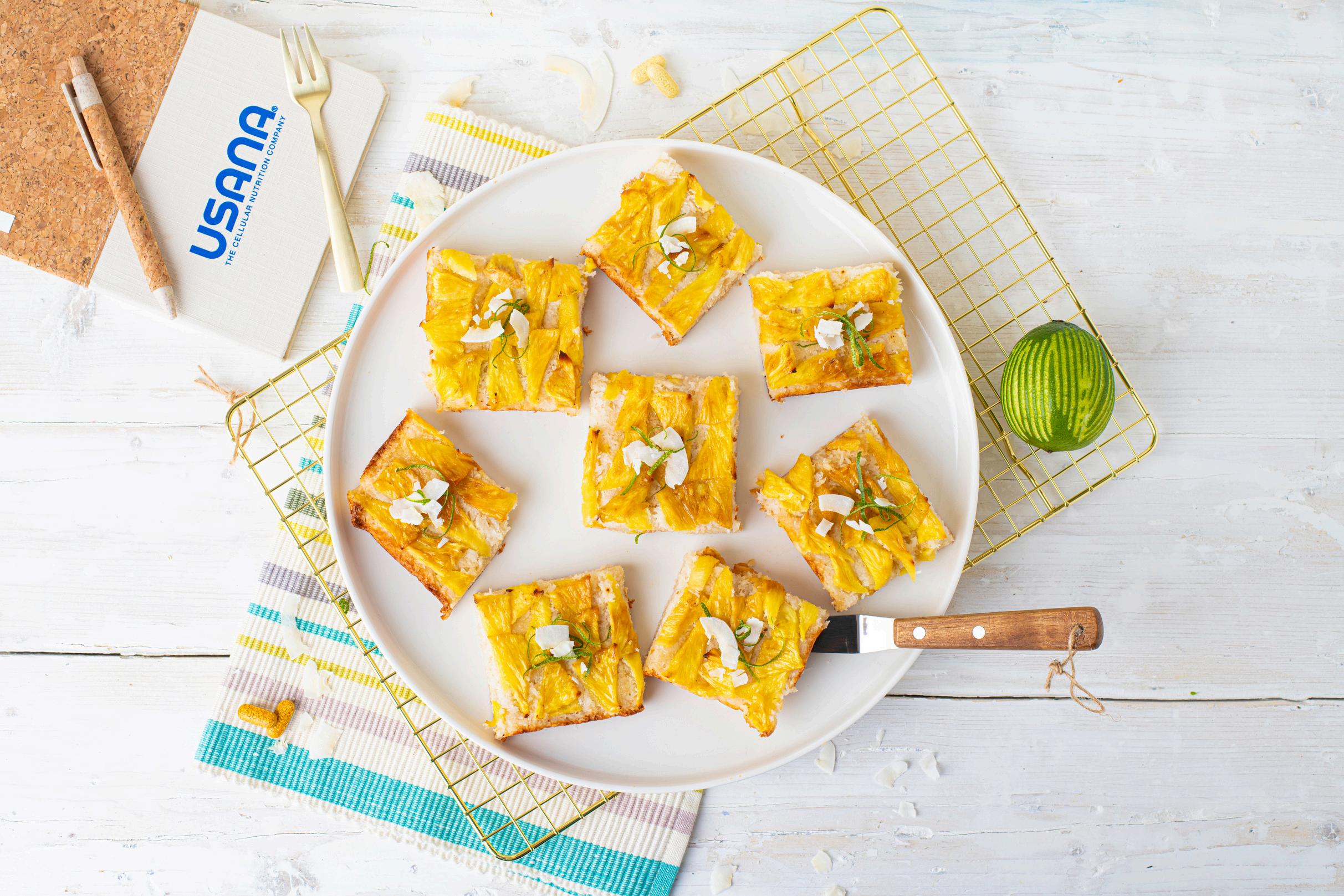 Nach dem Abkühlen in Rechtecke oder Scheiben schneiden und mit Kokosflocken und Limettenschale dekorieren