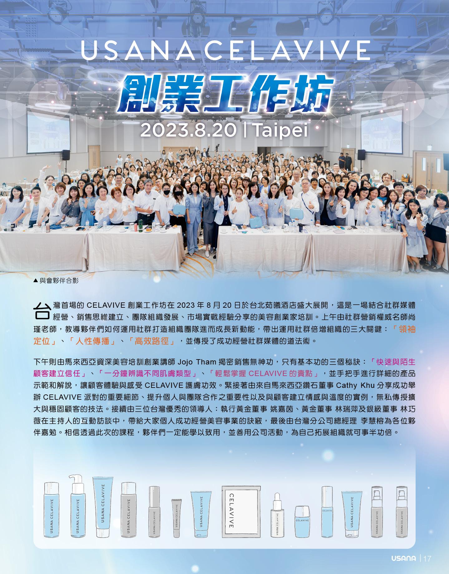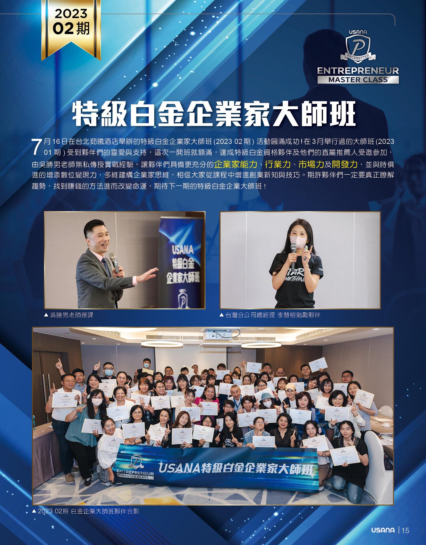 USANA 興趣創業說明會連發兩場,分別在 7 月 8 日 ( 六 ) 及 9 月 16 日 ( 六 )High 翻台北與高雄。結合健康、美 麗、知識讓夥伴們揪團運動,擁有健康更動出商機。現場除了健身課程、趣味互動體驗,更有最受歡迎的營養 餐試飲,讓夥伴與邀約前來的朋友深刻體驗 USANA 。在 USANA 菁英運動員分享環節,台北場特別邀請霹靂舞冠 軍張威榕;高雄場則是邀請混合健身冠軍洪寀睿,親臨現場分享他們使用 USANA 產品的感受與對 USANA 品牌的 認同;重磅講師不吝暢談創業心法,帶給夥伴們創業新思路,很多夥伴都邀約朋友前來感受嶄新的 USANA 。借力 使力,您在 USANA 創業就能更省力! 請您務必把握每次的創業說明會,邀約您的朋友前來輕鬆認識 USANA 與眾 不同!夥伴們!我們相約下一個會場,為您的 USANA 事業開疆闢土!
