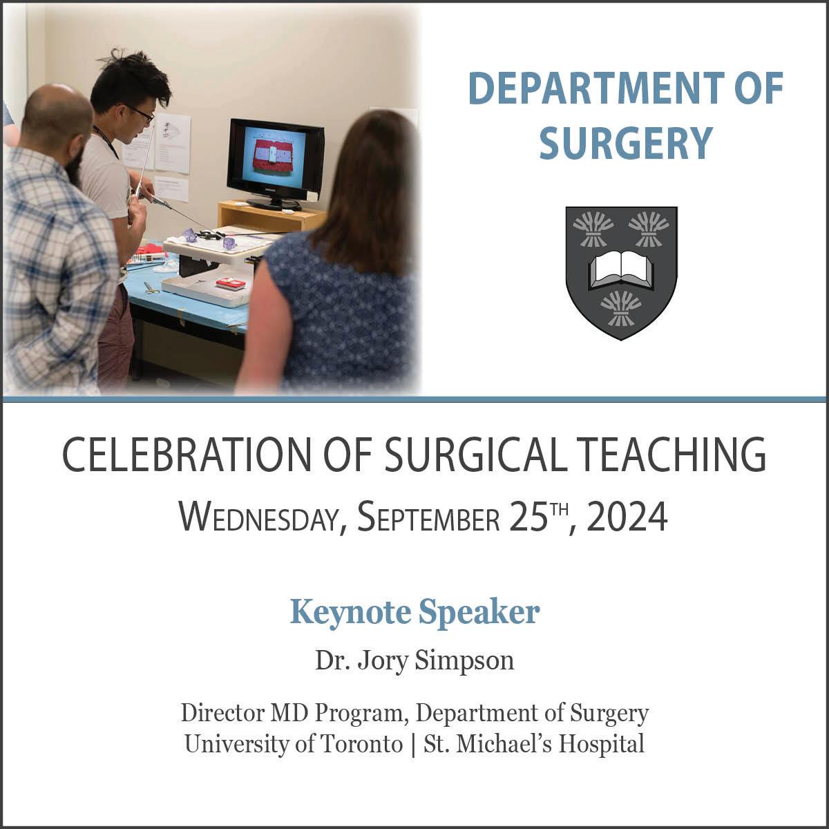 Lastly, we are pleased to announce that the annual Department of Surgery Celebration of Teaching will take place on Wednesday, September 25th, at the Sheraton Top of the Inn. We are honored to have Dr. Jory Simpson from Toronto as our guest speaker. Dr. Simpson, the creator of the Patient as Teacher program, will share his insights and experiences with us. We are looking forward to a memorable event and hope to see you all there!