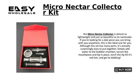Micro Nectar Collecto r Kit the Micro Nectar Collector is almost as lightweight and just as beautiful as its namesake. If you're looking for a dab piece you can bring with you anywhere, this is the ideal one for you. Although this set has many parts, it's actually surprisingly easy to put together. Simply add water to the bubbler chamber, secure the mouthpiece and tip in place, torch the tip till it's red-hot, and get to dabbing!
