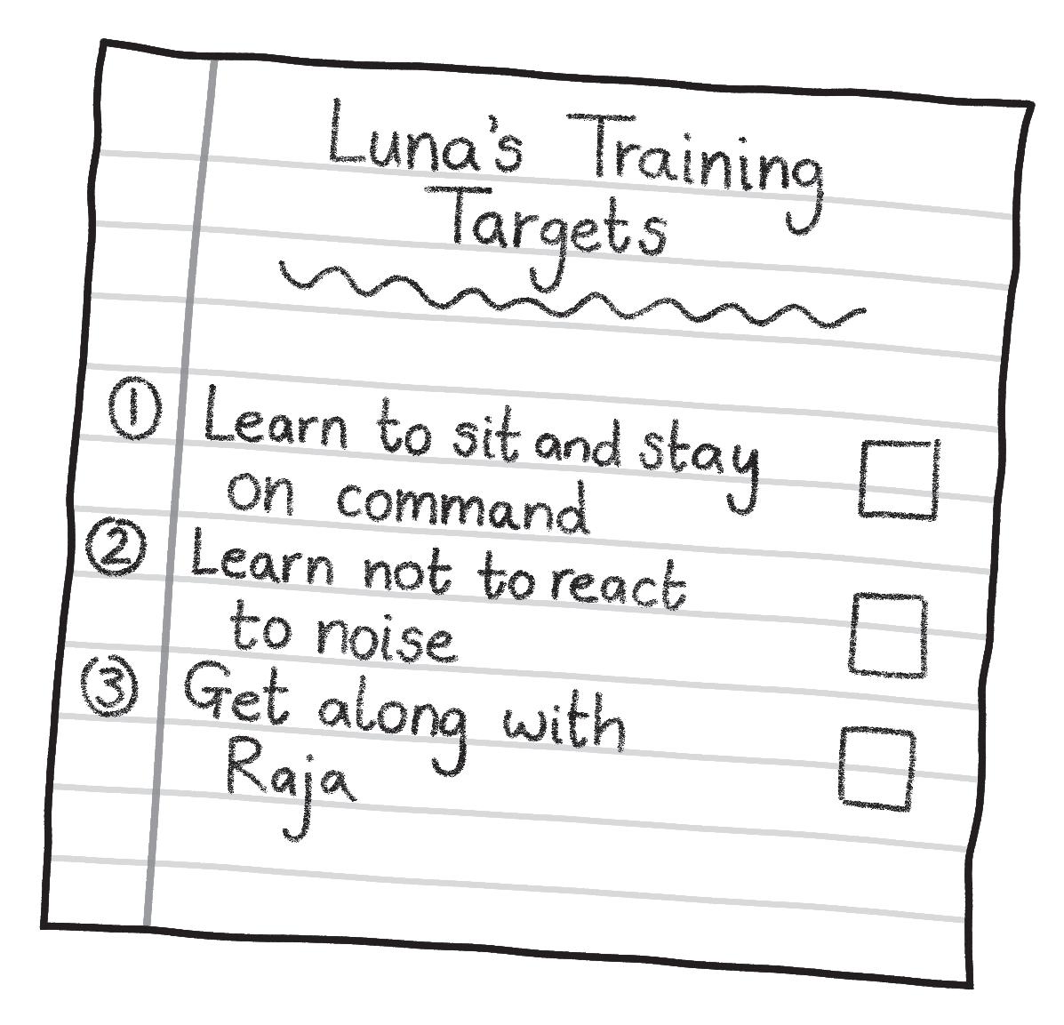 “We will,” I say confidently, and I mean it. “I know loads about puppies – I’ve read and watched everything on how to train them and I did extra prep last night.” I pull out the list I made of our three targets. “The first goal is getting Luna to sit and stay on command. Come on, let’s get started.”