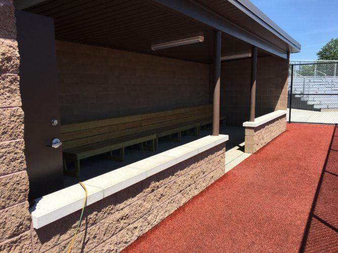 Game Production booth behind home plate for PA announcer, scoreboard operator, two digital boards for game atmosphere, music operator, and official score keeper. Dugouts with bathrooms