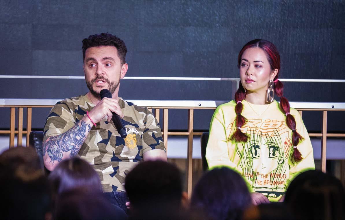 F J.J. Italiano, head of global hits at Spotify, and Kimiko Jensen, then director of digital marketing at Atlantic Records, discuss data and analytics at a faculty-led event on the music industry.