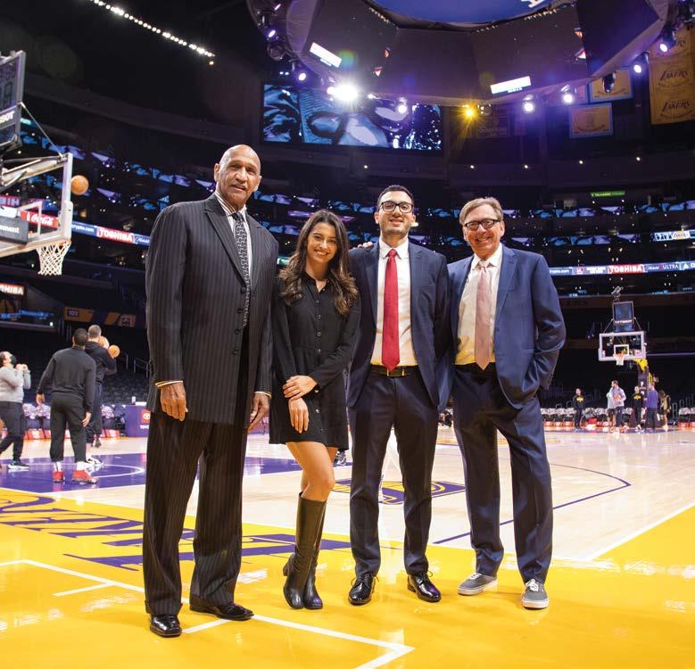 B USC Annenberg students participate in an on-court ceremony recognizing winners of the Chick Hearn Scholarship at a Los Angeles Lakers game.