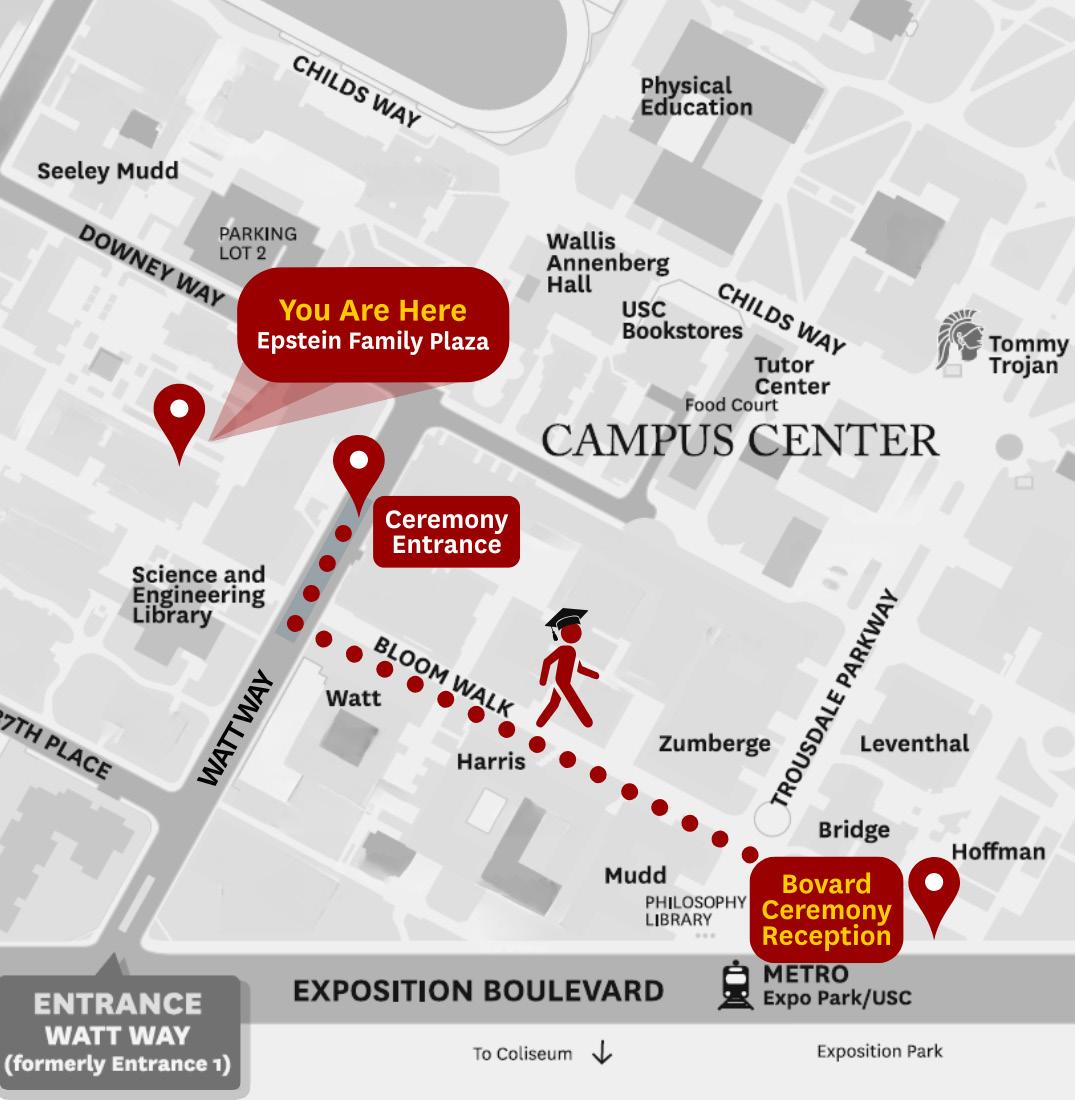 Exit the ceremony space and take a right on Watt Way. Turn left on Bloom Walk, crossing Trousdale Parkway to reach the reception on Bridge Hall Lawn. If you get lost, follow the line of Bovard College staff members in red shirts to the reception space.