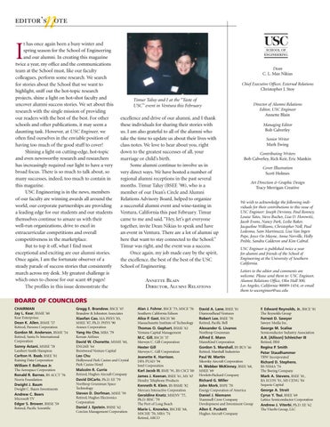 editor’s ote t has once again been a busy winter and spring season for the School of Engineering and our alumni. In creating this magazine twice a year, my office and the communications team at the School must, like our faculty colleagues, perform some research. We search for stories about the School that we want to highlight, sniff out the hot-topic research projects, shine a light on hot-shot faculty and uncover alumni success stories. We set about this research with the single mission of providing our readers with the best of the best. For other schools and other publications, it may seem a daunting task. However, at USC Engineer, we often find ourselves in the enviable position of having too much of the good stuff to cover! Shining a light on cutting-edge, hot-topic and even newsworthy research and researchers has increasingly required our light to have a very broad focus. There is so much to talk about, so many successes, indeed, too much to contain in this magazine. USC Engineering is in the news, members of our faculty are winning awards all around the world, our corporate partnerships are providing a leading edge for our students and our students themselves continue to amaze us with their well-run organizations, drive to excel in extracurricular competitions and overall competitiveness in the marketplace. But to top it off, what I find most exceptional and exciting are our alumni stories. Once again, I am the fortunate observer of a steady parade of success stories that consistently march across my desk. My greatest challenge is which ones to choose for our scant 48 pages! The profiles in this issue demonstrate the