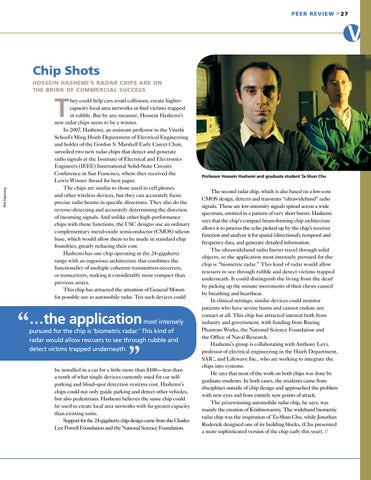 hey could help cars avoid collisions, create highercapacity local area networks or find victims trapped in rubble. But by any measure, Hossein Hashemi’s new radar chips seem to be a winner. In 2007, Hashemi, an assistant professor in the Viterbi School’s Ming Hsieh Department of Electrical Engineering and holder of the Gordon S. Marshall Early Career Chair, unveiled two new radar chips that detect and generate radio signals at the Institute of Electrical and Electronics Engineers (IEEE) International Solid-State Circuits Conference in San Francisco, where they received the Lewis Winner Award for best paper. The chips are similar to those used in cell phones and other wireless devices, but they can accurately focus precise radio beams in specific directions. They also do the reverse-detecting and accurately determining the direction of incoming signals. And unlike other high-performance chips with these functions, the USC designs use an ordinary complementary metal-oxide semiconductor (CMOS) silicon base, which would allow them to be made in standard chip foundries, greatly reducing their cost. Hashemi has one chip operating in the 24-gigahertz range with an ingenious architecture that combines the functionality of multiple coherent transmitters-receivers, or transceivers, making it considerably more compact than previous arrays. This chip has attracted the attention of General Motors for possible use as automobile radar. Ten such devices could